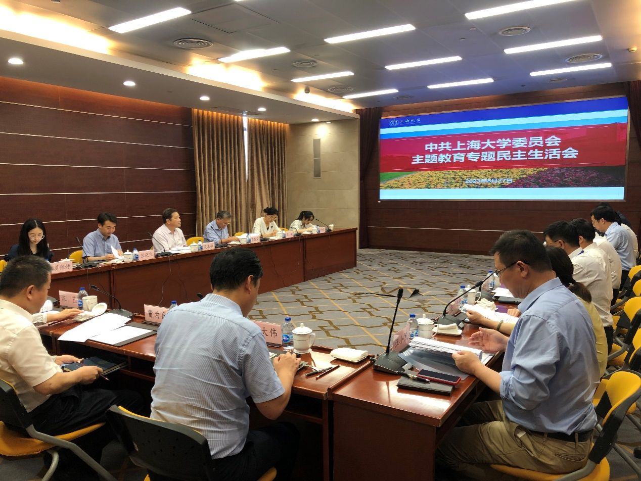 8月27日下午,beat365手机官方网站党委领导班子学习贯彻习近平新时代中国特色社会主义思想主题教育专题民主生活会在宝山校区乐乎新楼思源厅举行。市委主题教育领导小组第十八巡回指导组组长吴嘉敏、副组长李国荣及全体组员到会指导。全体校领导班子成员参加会议,会议由校党委书记成旦红主持。