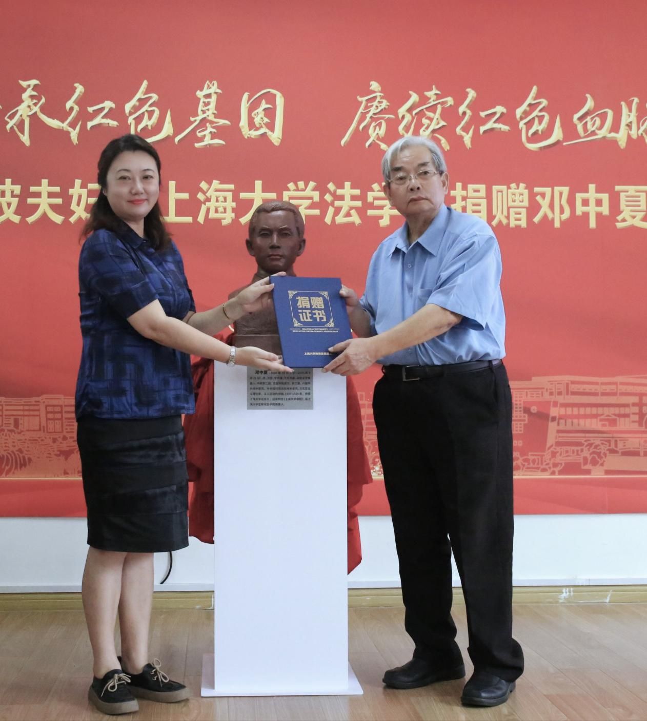 随后,会议举行邓中夏先烈雕塑捐赠仪式。邓邦镇卢波夫妇向beat365手机官方网站法学院捐赠由卢波老师亲自创作的邓中夏先烈雕塑,法学院党委书记徐国明代表学院接受捐赠,对外联络处副处长、校友办副主任杨静为邓邦镇卢波夫妇颁发捐赠证书。