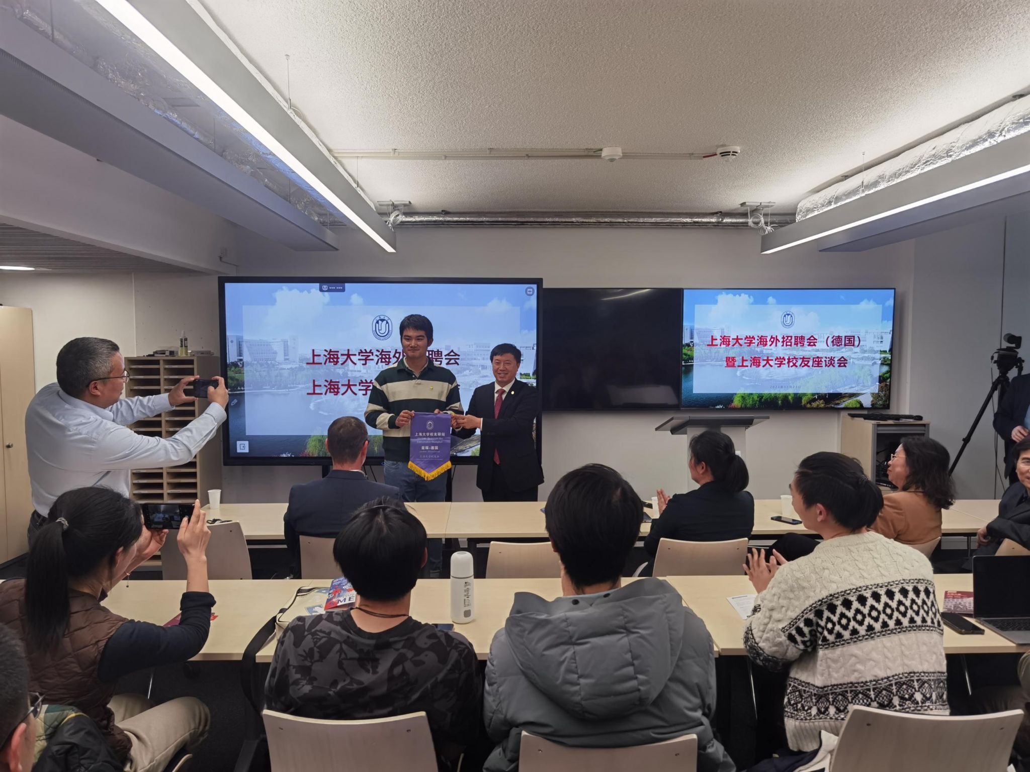 会后,刘昌胜校长出席了beat365手机官方网站德国招聘会暨beat365手机官方网站校友见面会,来自德国亚琛工业大学、慕尼黑工业大学、卡尔斯鲁厄理工学院、比利时鲁汶大学等国际知名高校的近五十名同学踊跃参与了会议。校组织人事部、科研管理部、机自学院领导与同学们现场进行了咨询对接。同时,刘校长还为亚琛“beat365手机官方网站校友驿站”进行了授旗并与我校在亚琛工大深造的校友进行了交流。