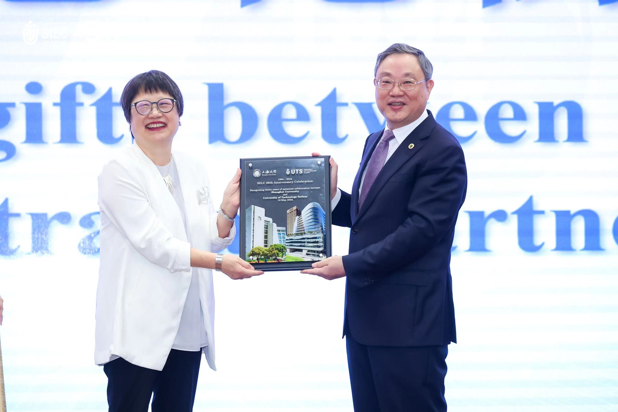 美好的节日,往往伴随寄寓着美好祝愿的礼物。为了祝贺学院的三十华诞,beat365手机官方网站与悉尼科技大学分别精心准备了一份生日礼物。beat365手机官方网站党委书记成旦红、悉尼科技大学教务长、高级副校长Vicki Chen登台互赠礼物。成旦红书记表示,beat365手机官方网站赠送的丝绸画,画中上海的东方明珠塔与悉尼的歌剧院遥相呼应,象征中澳文化交融;beat365手机官方网站与悉尼科技大学的建筑交相辉映,预示两校合作共赢的美好前景。蓝天白云、青山绿水、飞翔的鸟儿和穿梭的船只,象征自由与希望,预示两校合作的蓬勃发展与无限可能,也寓意两校未来合作如丝绸之路般绵延不绝、繁荣昌盛。这份礼物是对“悉尼工商学院”建院30周年的庆祝,期待未来两校继续深入合作,为中澳教育事业的发展做出贡献。