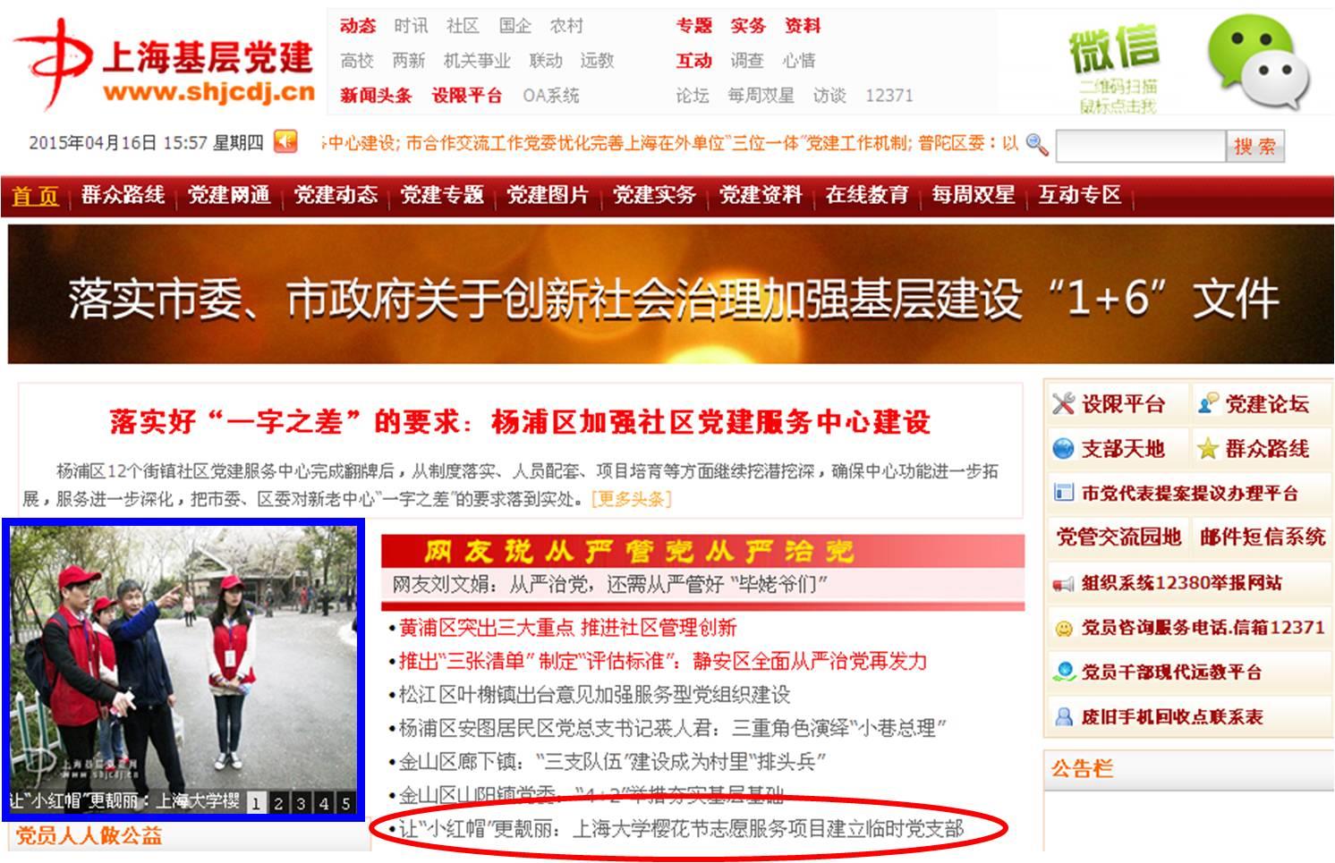 4月16日,上海市基层党建网(http://www.shjcdj.cn/)首页以《让“小红帽”更靓丽:beat365手机官方网站樱花节志愿服务项目建立临时党支部》为题,报道了我校上海樱花节志愿者临时党支部工作。为把党建开展到最活跃的“细胞”上,在校党委组织部、校学工办、校团委的关心指导下,本次由社科学院、美术学院以及经济学院联合主办的2015上海樱花节志愿服务工作中,首次成立了临时党支部,24名党员志愿者在志愿服务中不仅传播了树立文明新风尚的正能量,更带动了全体志愿者把更优质的服务奉献给他人,树立了党员先锋模范良好形象,获得游客及社会的广泛赞许。