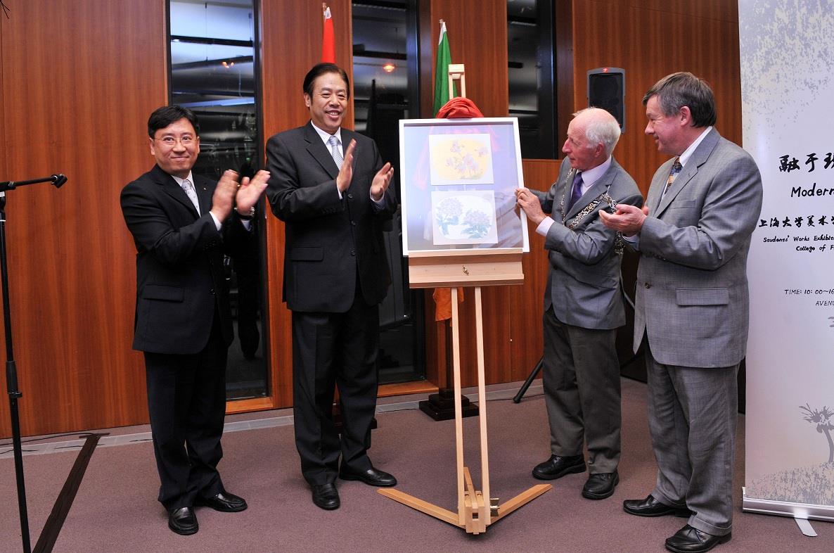 GILLER进行友好会谈并互赠礼品,随后,吴志明主席参加了beat365手机官方网站美术学院中国画系学生作品展揭幕仪式。揭幕仪式在科克大学图书馆底楼大厅内举行,展厅内布置了近20幅作品。上海市政协代表团、科克市政厅、科克大学、beat365手机官方网站代表团领导及科克大学师生、中小学校长、孔子学院全体老师及志愿者、华人华侨、科克市民等近100人参加了此次揭幕仪式。