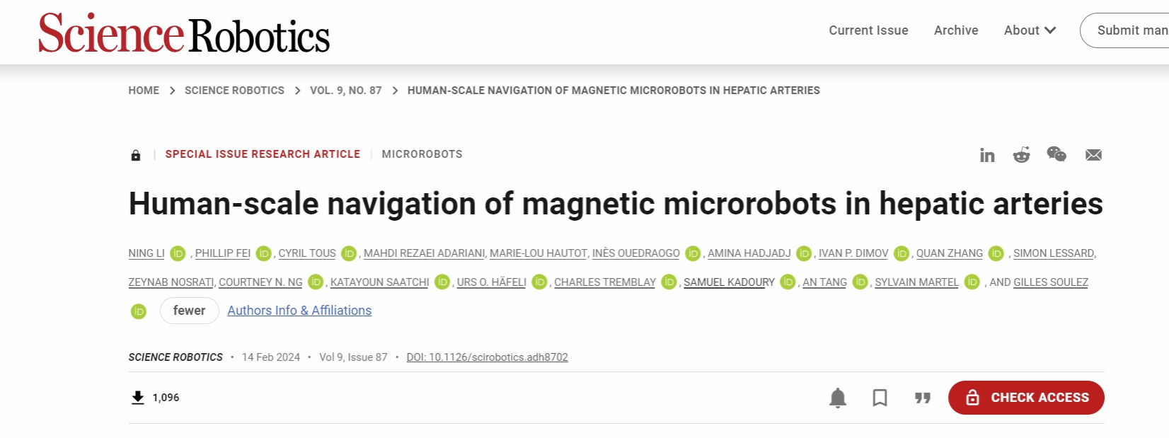 近日,beat365手机官方网站机电工程与自动化学院张泉教授团队联合国内外合作者,在Science子刊《Science Robotics》(机器人领域排名第一)以共同通讯作者发表题为“Human-scale Navigation of Magnetic Microrobots in Hepatic Arteries”的研究工作。
