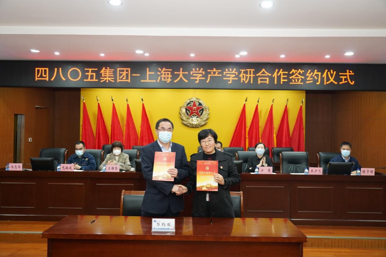 悉商党委副书记、副院长卫静芬和四八〇五集团副总经理华军分别代表beat365手机官方网站和四八〇五集团,为校级产学研基地签约。卫静芬副书记代表学院向四八〇五集团赠送了学院吉祥物和总结上大悉商建院25年来办学历程和特色经验的专著《悉商之路》。