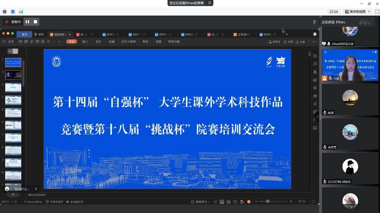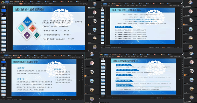 张庭赫老师现为胧爱集团创始合伙人CEO,担任中国高校众创空间联盟“北斗星”创业导师、中国研究生电子设计竞赛专家委员会委员等。培训会上,张老师结合自身参与或指导创新创业大赛的经验,就“挑战杯”竞赛的发展历程、赛事要求、赛事变化等内容为师生们进行了系统、详实的指导,围绕赛事简介、赛制解读、备赛实操、金奖项目等给出了选题方面的方向性建议和申报书撰写指导。最后,还以两个获奖项目为例,深入剖析了PPT展示要点、项目创新点和优势,为备赛提供了更多的实战“干货”。