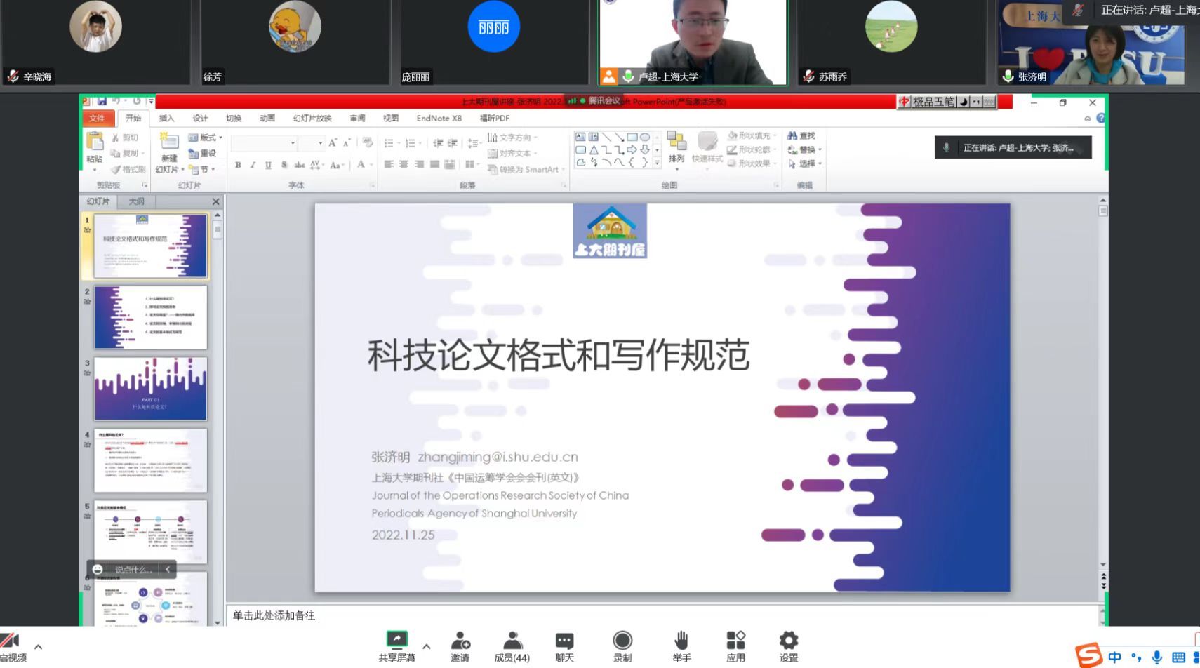 11月25日,在beat365手机官方网站青年教师联谊会、管理学院党委、出版社期刊社党委的指导下,管理学院青年教师联谊分会与出版社期刊社青年教师联谊分会联合举办英文科技论文与学术期刊交流活动。上海市科技期刊审读专家、《中国运筹学会会刊》(Journal of the Operations Research Society of China)编辑部主任张济明老师担任主讲嘉宾,出版社期刊社青年教师联谊分会会长吴领叶老师与管理学院青年教师、研究生等四十余人与会交流,会议由管理学院青年教师联谊分会会长卢超老师主持。