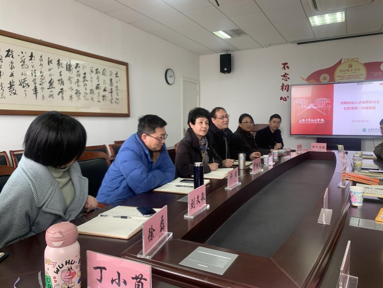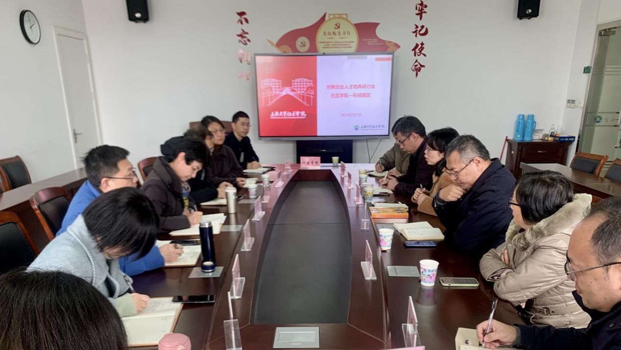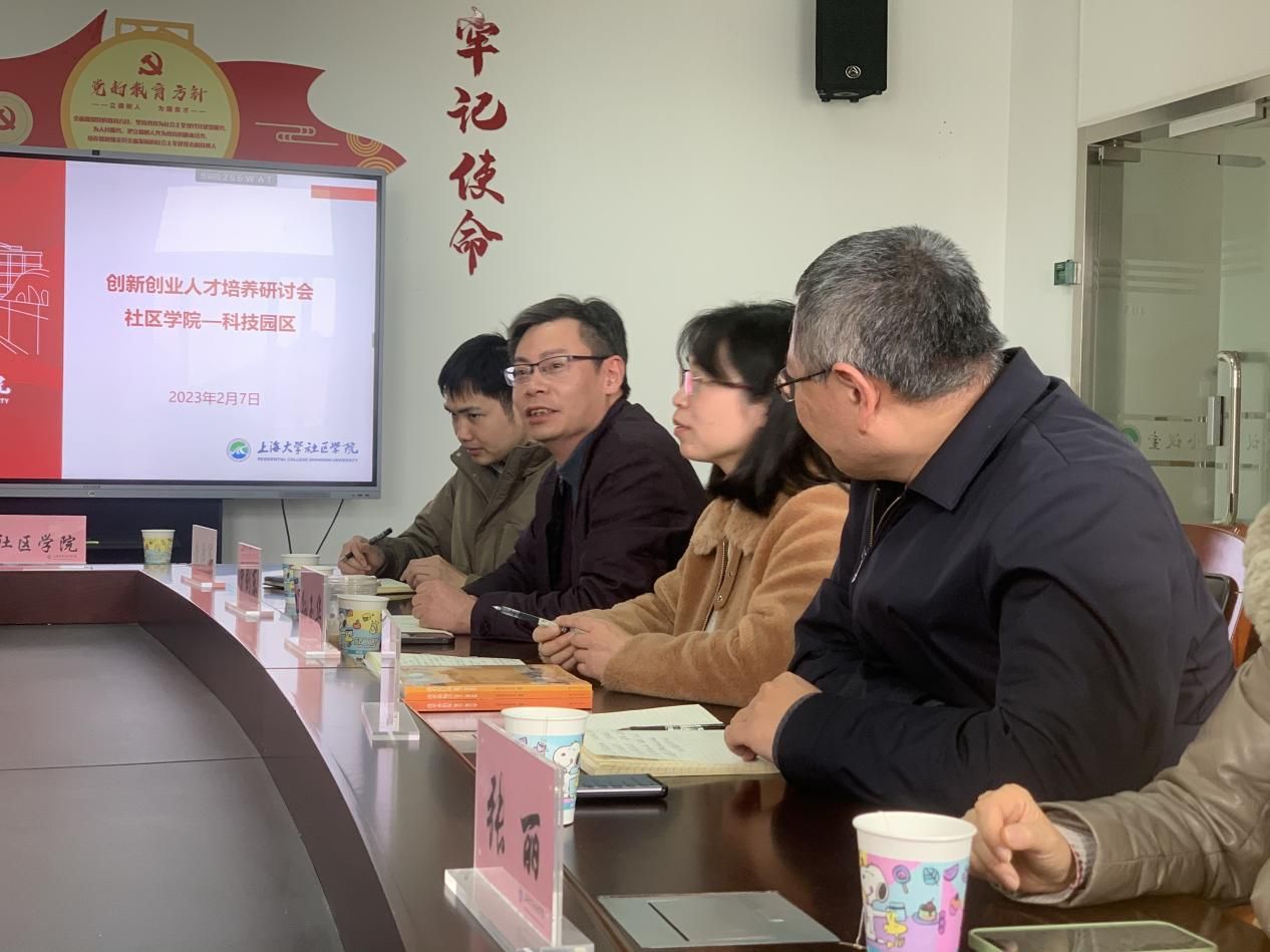 2月7日下午,beat365手机官方网站科技园区领导一行来社区学院就合作培养创新创业人才进行研讨交流。学校科产系统党委副书记孙玉华、科技园区副总经理劳剑东、科技园区副总经理岳中岳、创业部经理张丽、创业部主管黄泽军及社区学院全体领导班子和有关部门负责人参加了会议。