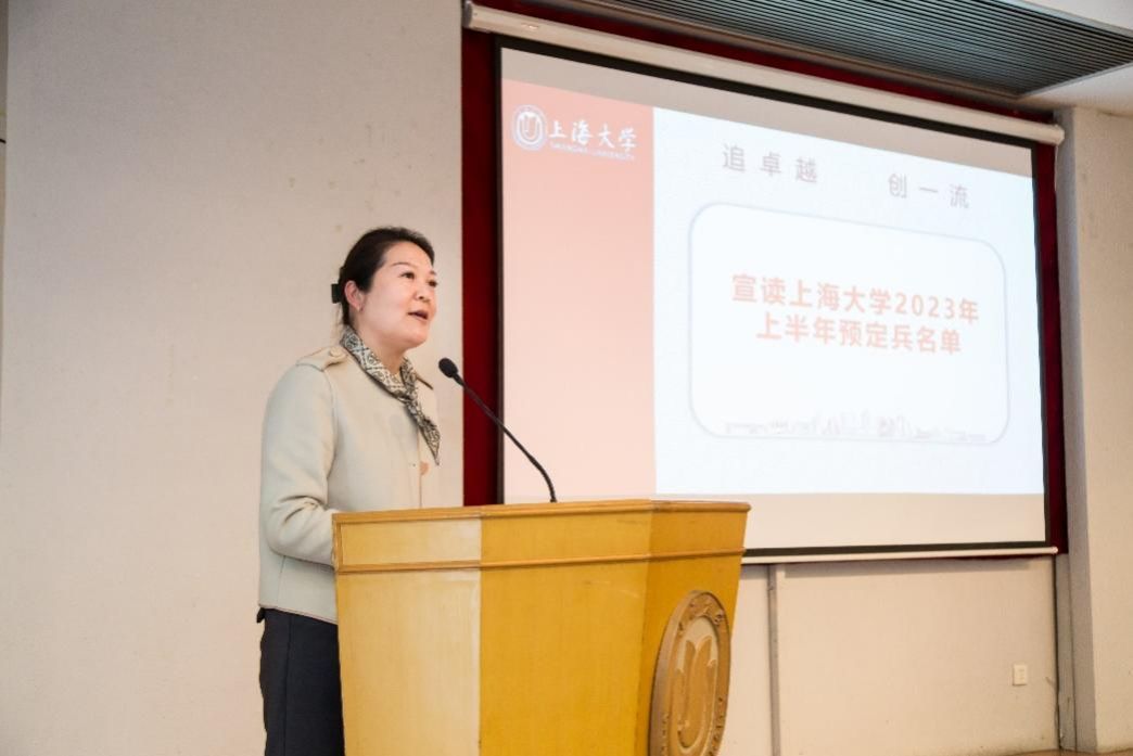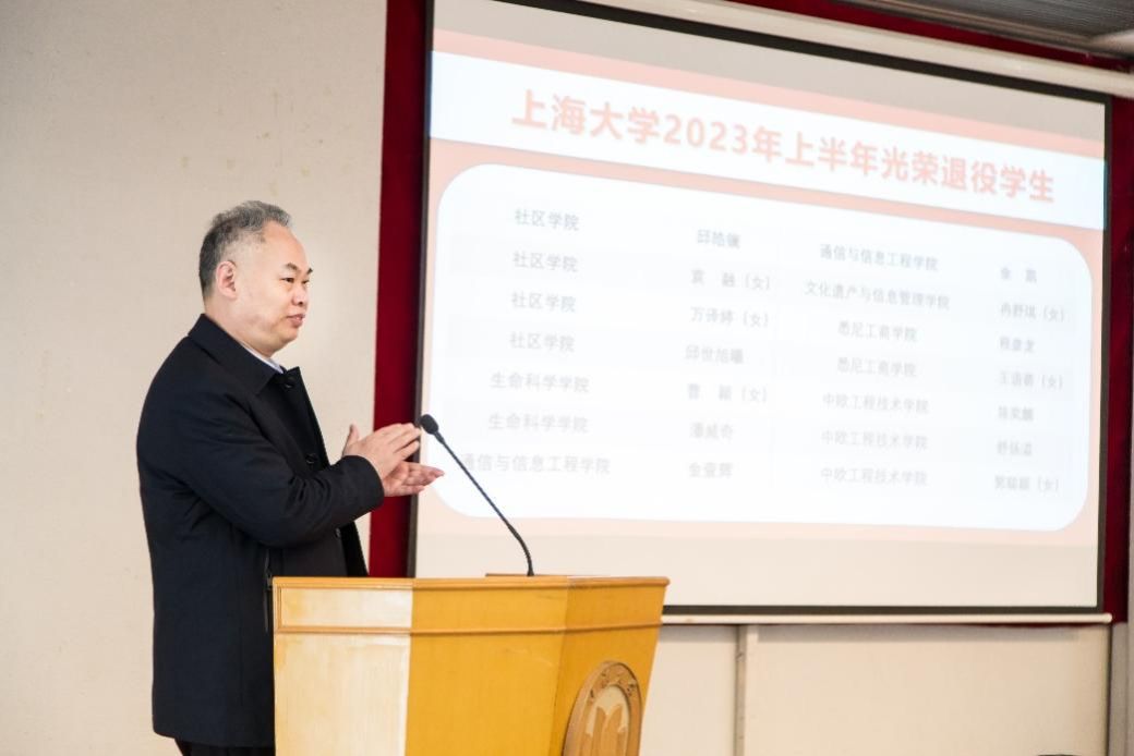 阳春三月,万物生长。3月8日上午,beat365手机官方网站2023年上半年退役学生欢迎大会暨新兵出征仪式在宝山校区行政楼报告厅举行。校党委常委、副校长聂清,招生与毕业生就业工作办公室主任陆瑾,教务部常务副部长彭章友,学生办公室主任、武装部部长、本科生书院管理中心主任孟祥栋,党委研究生工作部部长魏宏,研究生院培养管理处处长毛建华,党委宣传部融媒体中心副主任谢瑾,校团委副书记王杰,相关学院党委副书记、副院长,辅导员代表,“橄榄绿”社团代表,2023年上半年退役复学学生代表及全体预定兵,以及部分预定兵学生家属参加活动。会议由孟祥栋主持。