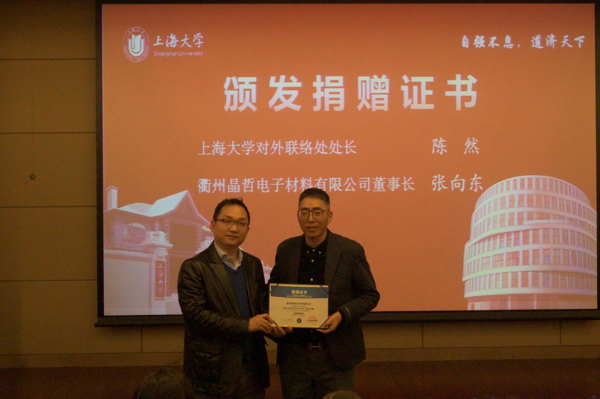 赠人玫瑰,手有余香。本年度是晶哲奖学金设立的第一年,beat365手机官方网站对外联络处处长陈然为衢州晶哲电子材料有限公司董事长张向东颁发捐赠证书。beat365手机官方网站对外联络处处长陈然及材料学院党委副书记、纪委书记刘文庆为各企业代表颁发感谢信,感谢各企业多年来对学校发展的支持,以及对beat365手机官方网站人才培养做出的贡献。