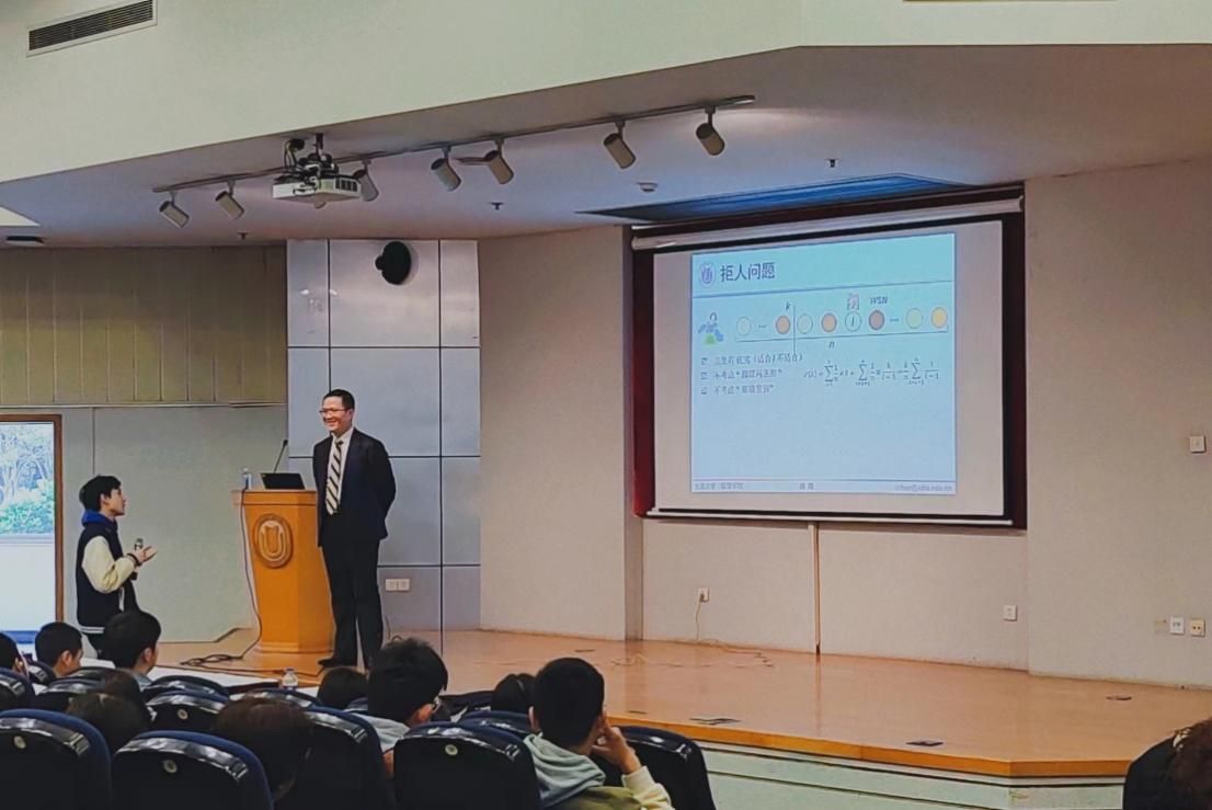 接着,镇教授开始讲述“管理科学”相关的内容。首先,镇教授详细介绍了什么是管理,他认为“管”和“理”拥有着不同的内涵,“管”指的是人的艺术,“理”指的是事的科学,总结为“管人+理事”。镇教授提出研究管理科学最核心的课程是运筹学和统计学,此后他通过引用数学理论基础课的知识,用严谨的数学表达式来解释拒人问题、商品购买问题的管理学常见问题。