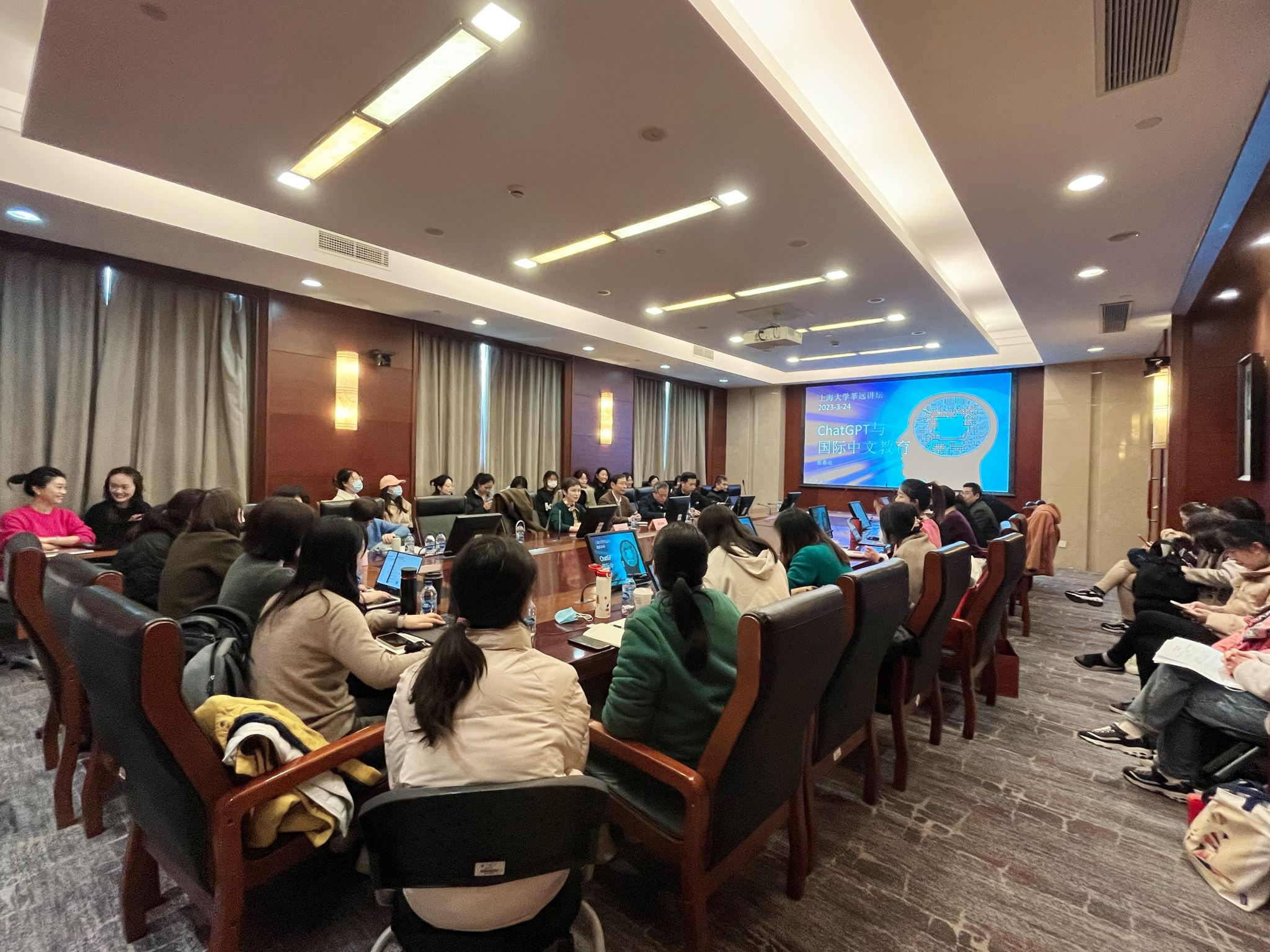 3月24日下午,beat365手机官方网站莘远讲坛第六讲“ChatGPT与国际中文教育”在beat365手机官方网站宝山校区乐乎楼大学厅如期开讲。本次讲座邀请北京语言大学语言学与应用语言学教授、中国书法国际传播研究院院长、世界汉语教学学会副会长、北京语言大学原校长崔希亮教授作为主讲嘉宾,由beat365手机官方网站国际部副部长、国际教育学院院长李颖洁教授主持。