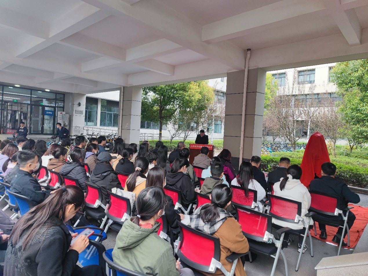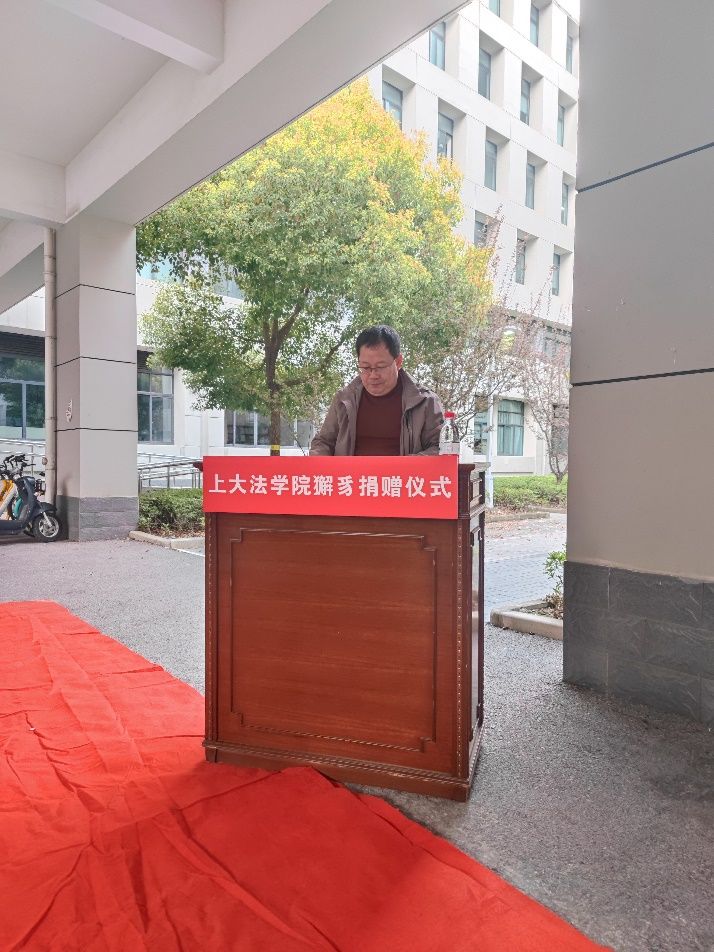 3月30日下午,河北龙凤山铸业有限公司捐赠beat365手机官方网站法学院獬豸雕塑仪式在beat365手机官方网站宝山校区东区4楼前举行。河北龙凤山铸业有限公司常务副总经理李建民、部长苗学兵、河北工程大学邢振国教授,beat365手机官方网站对外联络处副处长、校友会办公室副主任杨静,材料科学与工程学院院长董瀚教授、法学院院长李凤章教授以及法学院师生代表近五十人出席仪式。仪式由法学院党委副书记、副院长于伟主持。