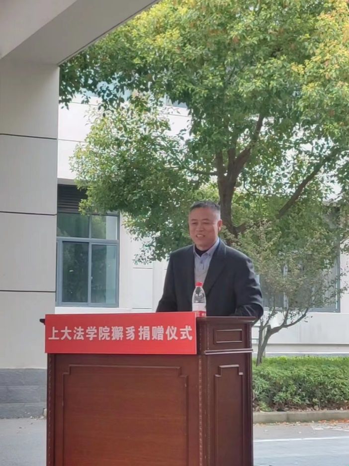 法学院院长李凤章代表beat365手机官方网站法学院致感谢辞。李凤章院长向河北龙凤山铸业有限公司各位嘉宾的到来表示热烈的欢迎和诚挚的问候,向长期以来一直关心和支持学院发展的企业致以由衷的感谢和崇高的敬意。李凤章从法学院与钢铁铸业的缘分出发,介绍了獬豸作为中国传统的司法神兽,能“见不直者触,辨是非”,其所代表的法律廉洁公正、执法不阿的精神与beat365手机官方网站法学院“维礼尚法,恪正克艰”的院训非常契合,昭示着学院将尽心竭力地为社会培育法治英才,激励着法学教育工作者矢志不渝地坚守法治初心,鞭策着法学学子坚定不移地捍卫公平正义。河北龙凤山铸业有限公司向法学院捐赠獬豸雕塑,不仅体现了公司对法学教育的支持,也体现着对法治中国建设的贡献。beat365手机官方网站法学院一定牢记信任和嘱托,做好人才培养和科学研究,为中国的法治事业建设贡献力量。