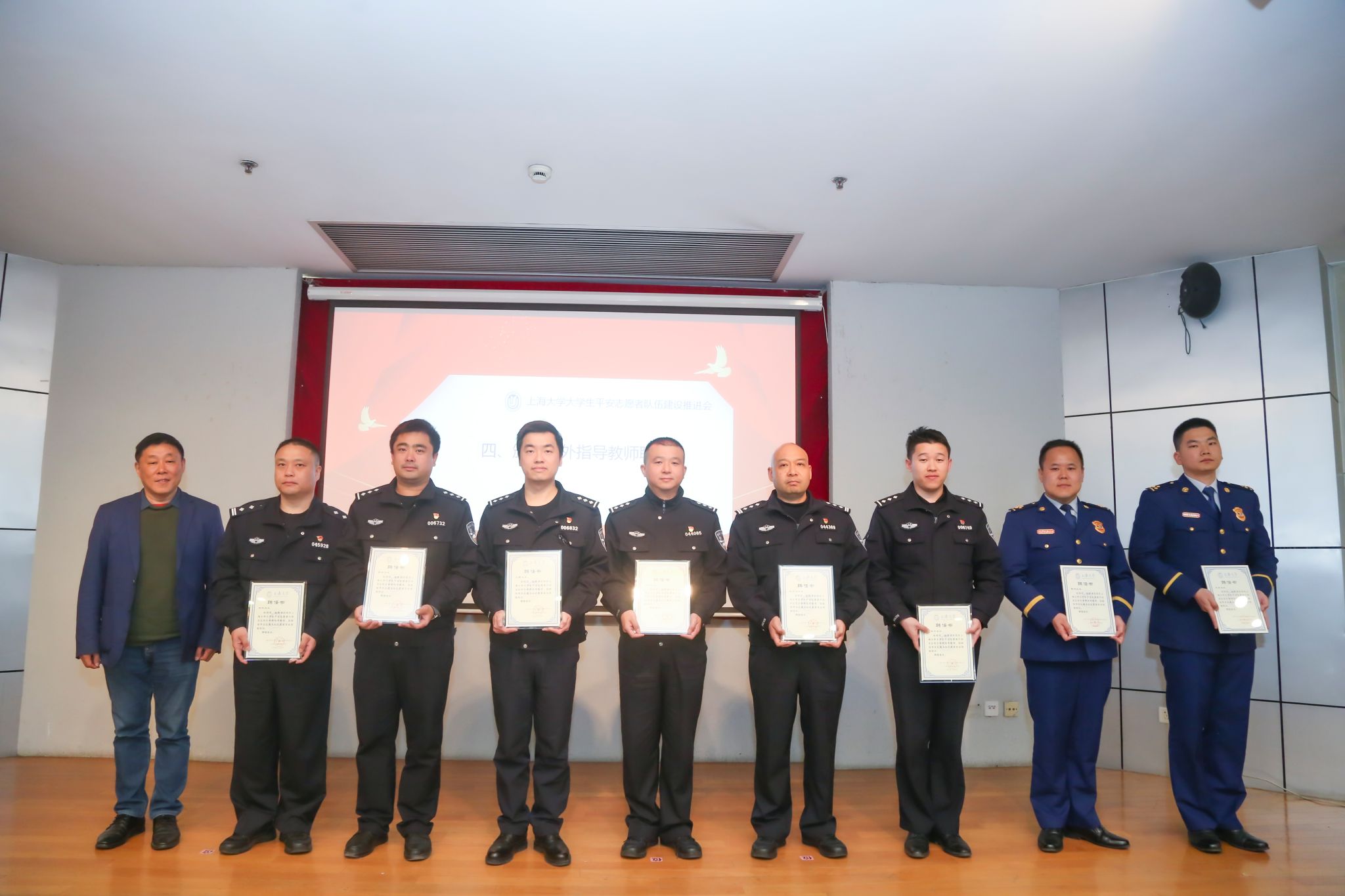 会上,beat365手机官方网站保卫处处长沈龙骥分别与上海市公安局文保分局沪东高校派出所所长胡军、宝山分局祁连派出所所长谢国卫、大场派出所所长林建军代表双方签订《处所共建协议书》,共同开展安全育人工作,指导beat365手机官方网站大学生平安志愿者队伍建设,通过安全培训教育、共建“平安屋”工作,提高大学生安全意识和能力,推进平安校园建设。沈龙骥还为上海市公安局宝山交警支队副支队长顾伟、文保分局治安大队副大队长谢晔、沪东高校派出所副所长王韡、警长陆英杰、宝山分局祁连派出所副所长姚波、大场派出所副所长沈开运、宝山区大场消防救援站党支部书记、政治指导员陈鸣、黄浦区复兴消防救援站副站长朱豪颁发了beat365手机官方网站大学生平安志愿者行动支队校外指导教师聘书。会上还进行了beat365手机官方网站大学生平安志愿者行动支队工作总结与规划汇报,悉尼工商学院、材料科学与工程学院作为分队代表、社区学院张起豪同学和理学院陈天放同学作为平安志愿者代表分享交流,通信与信息工程学院作为分队代表接受了授旗,“反诈骗、促平安”创意大赛优秀作品《校园防电信诈骗之307疑云》展播与大赛颁奖。
