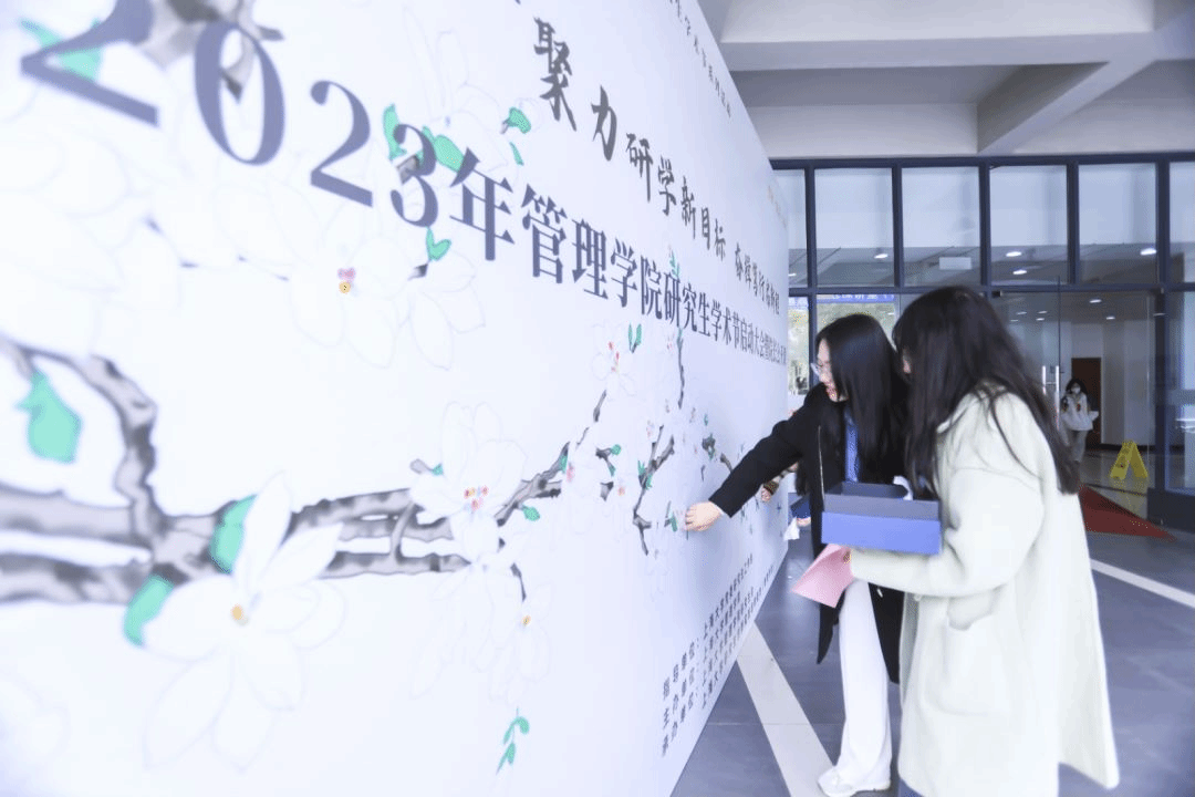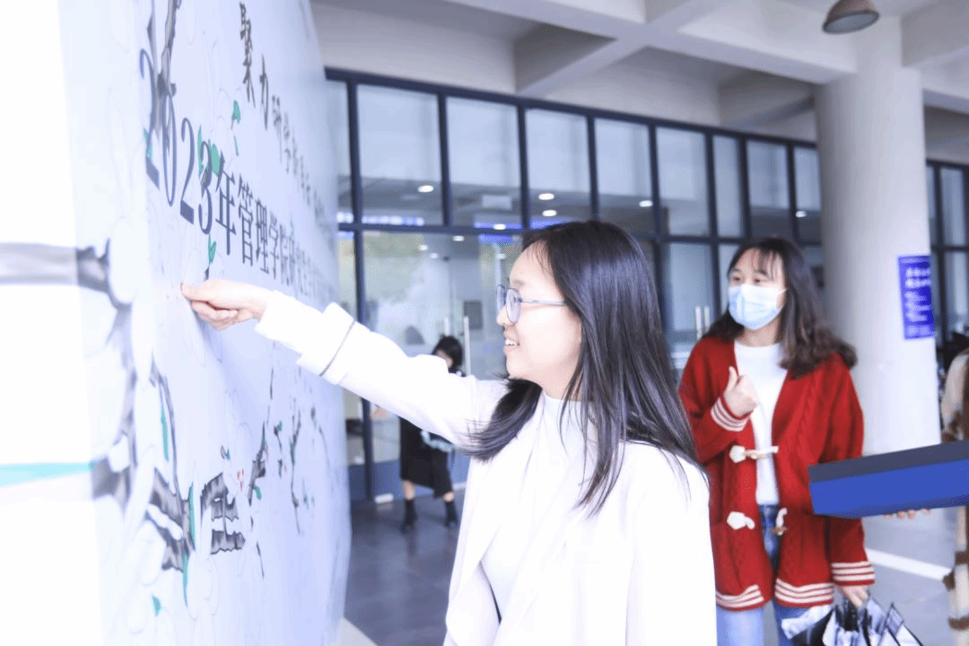 聚力研学,百花齐放。以白玉兰寓科研载体,管理学院嘉宾老师以及研究生们在学术宣誓墙上以指纹为花蕊,以示坚守学术道德、严守学术规范与追求学术创新的决心,共同绽放绚丽多彩的学术之花。