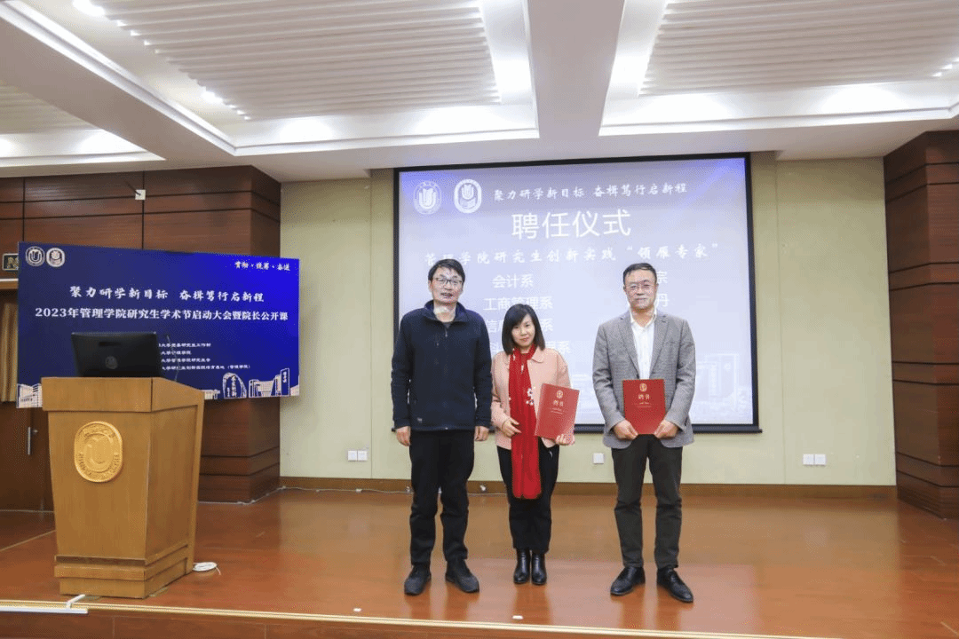 2022年管理学院持续聚焦研究生创新创业学科竞赛能力培养,获批beat365手机官方网站党委研究生工作部审批首例首批“beat365手机官方网站研究生创新实践培育基地”建设。为响应新时代研究生教育改革的发展,着力培养我院研究生卓越创新能力,管理学院特聘首批研究生创新实践领域专家:管理学院管理科学与工程系周建老师、管理学院工商管理系赵红丹老师、管理学院信息管理系邹宗峰老师、管理学院会计系方宗老师。由管理学院副院长许学国老师向受聘教师代表颁发聘书。