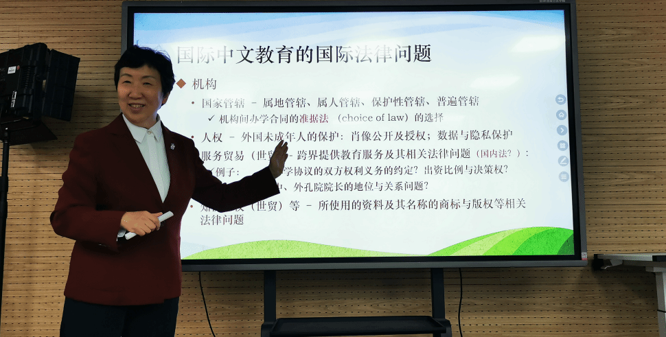 接下来,宋老师从国际法角度对国际中文教育进行解读,从机构、个人、争端及其解决等方面探讨了国际中文教育的国内法律问题与国际法律问题,内容涉及办学与教学相关的行政法与民法、国家管辖、服务贸易、知识产权、人权、争端解决途径等等。就国际中文教育国际法律性质而言,它是教育服务的跨界贸易,涉及服务和人员的跨界流动等方面。宋老师用教师们工作与生活中熟悉的场景举例,如出国办理签证等涉及的国际法问题、所使用的资料及其名称的商标与版权、机构间办学合同的准据法的选择以及人权保护及救济措施等,深入浅出地解读,同时提醒外派教师们要提高权利意识,增强自我保护意识。