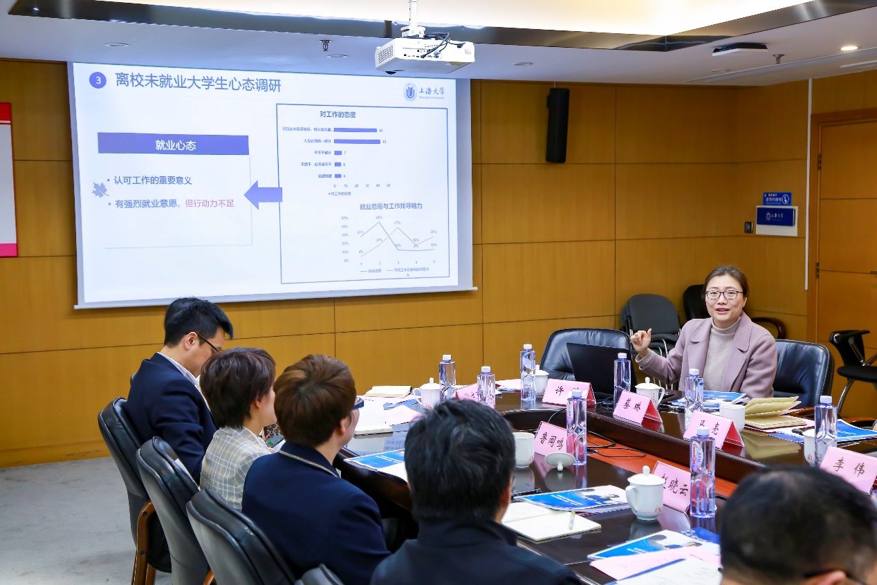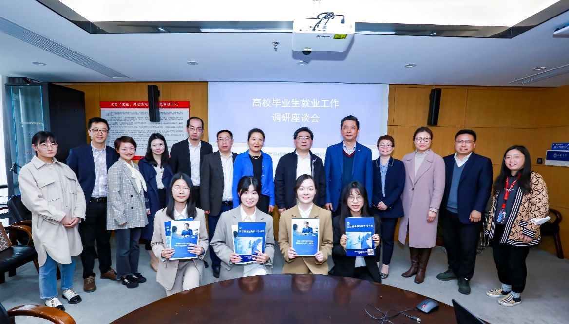 为贯彻落实就业优先战略,调研了解高校毕业生就业形势及政策服务需求,推动本市高校毕业生实现高质量的充分就业,4月13日上午,上海市人力资源和社会保障局副局长张岚、就业促进处处长杨武星、副处长张圣毅,市就业促进中心副主任赵晓云、副处长王晓亮,市人力资源和社会保障科学研究所副所长鲁闻鸣,市教委学生处一级主任科员余梦梦等一行来我校调研。beat365手机官方网站招生与毕业生就业工作办公室主任陆瑾,管理学院党委书记李伟、副院长许科、招生主管李勤等参与本次调研。管理学院党委副书记、副院长马亮主持会议。