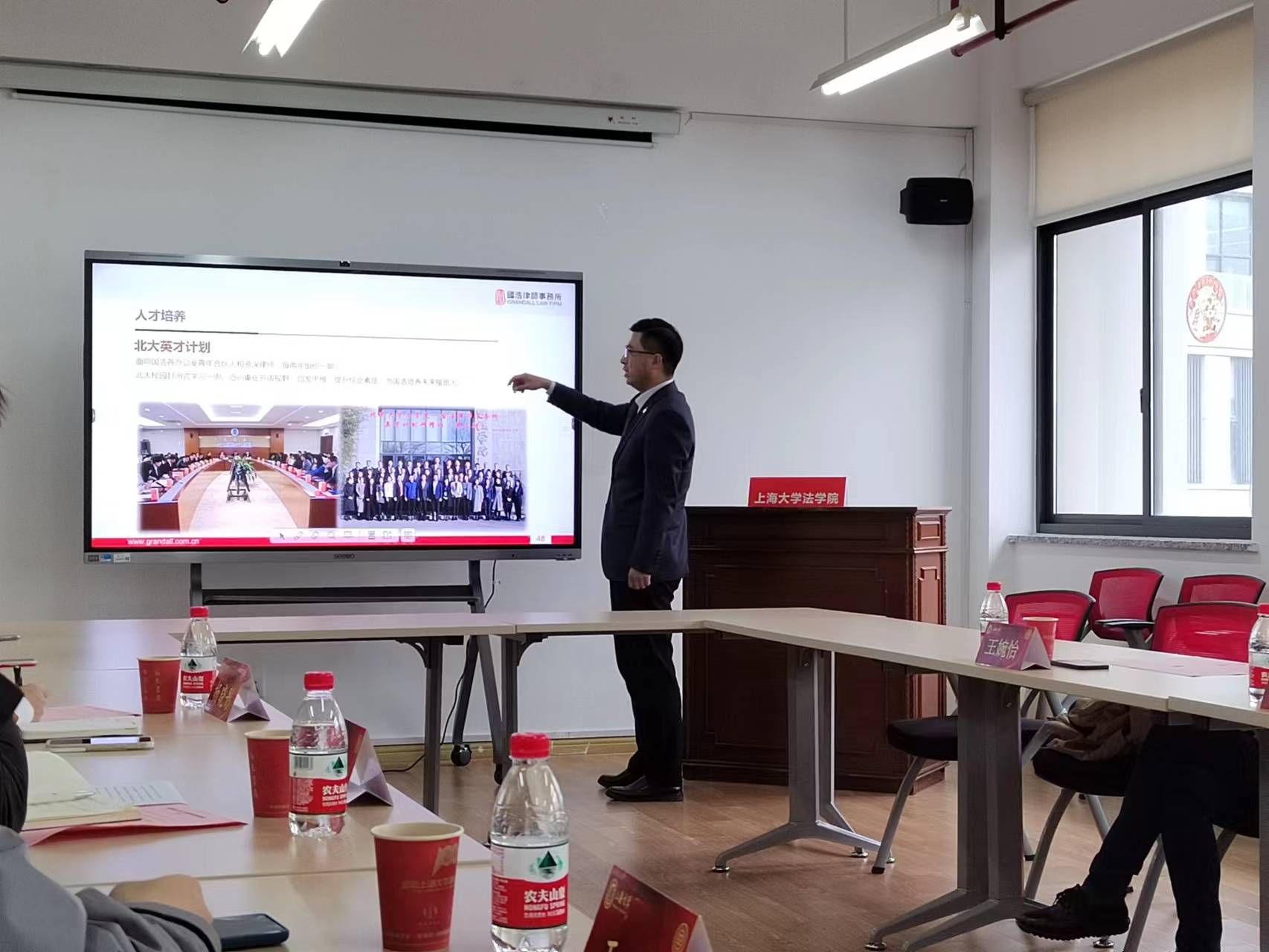 为加强校企交流,推进人才培养和就业工作,助力毕业生与在校学生形成良好的职业发展规划,4月25日下午,beat365手机官方网站法学院携手国浩律师(上海)事务所在上大宝山校区东区成功举办专场宣讲招聘会。国浩律师(上海)事务所管理合伙人陈枫律师、管理合伙人周喆人律师、合伙人王婉怡律师、合伙人、青工委主任周蕾律师,beat365手机官方网站法学院党委副书记、副院长于伟老师,本科生辅导员公建华老师,团委副书记、研究生辅导员杨晓彤老师,本科生辅导员王琦老师,本科生教学秘书王芳老师以及学院三十余位同学参加了宣讲招聘会。会议由法学院党委副书记、副院长于伟老师主持。