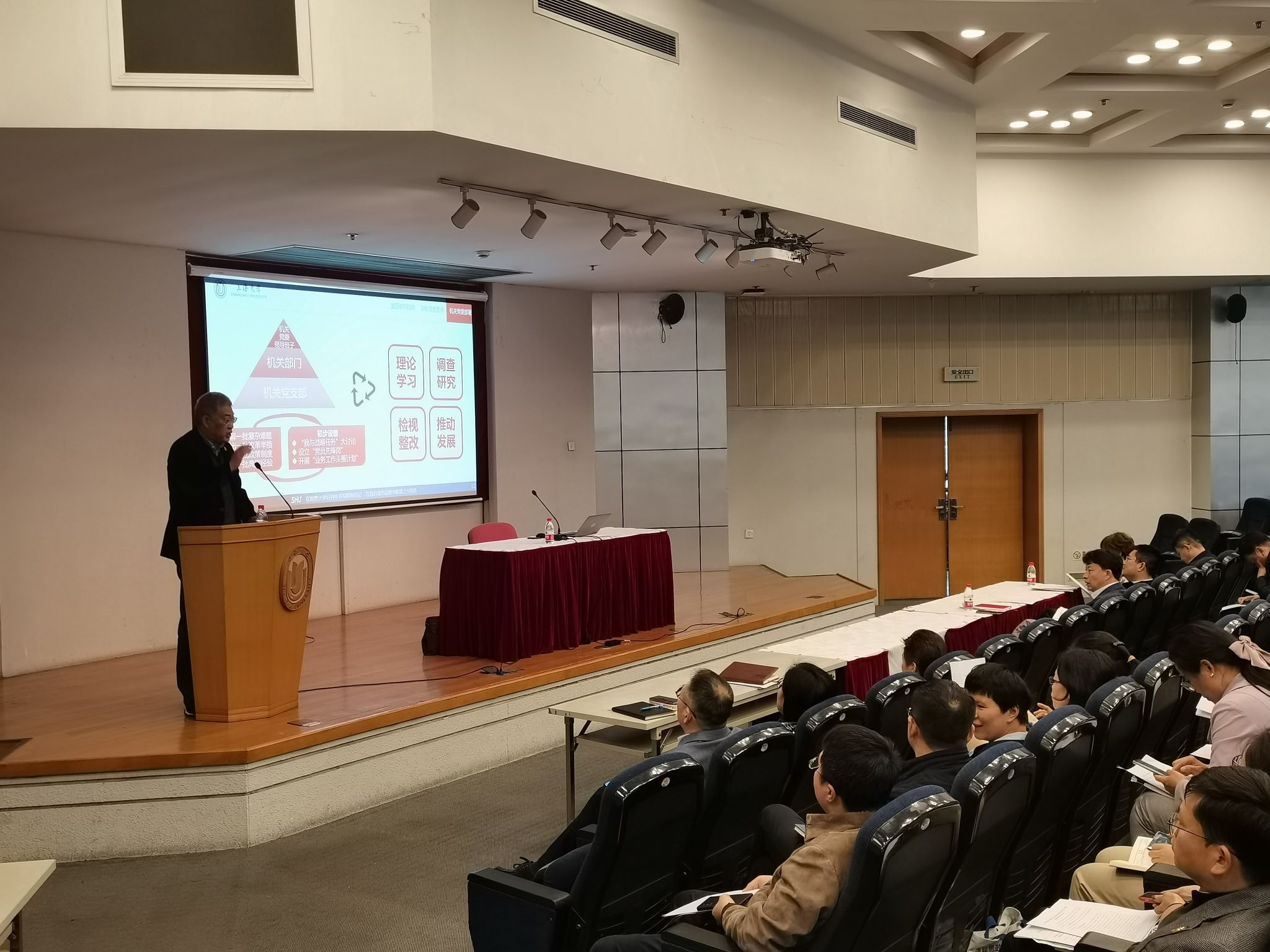 4月24日下午,beat365手机官方网站机关党委在校本部行政楼报告厅召开学习贯彻习近平新时代中国特色社会主义思想主题教育动员部署会。机关党委班子成员,机关纪委班子成员,机关各部门领导班子成员,机关各党支部书记、委员,机关党委和党校联合举办的科级干部、群团干部、党支部纪检委员3个培训班的学员等参加了会议,学校党委主题教育领导小组办公室联络组副组长许烁也出席了本次会议。会议由机关党委副书记、纪委书记王沁主持。