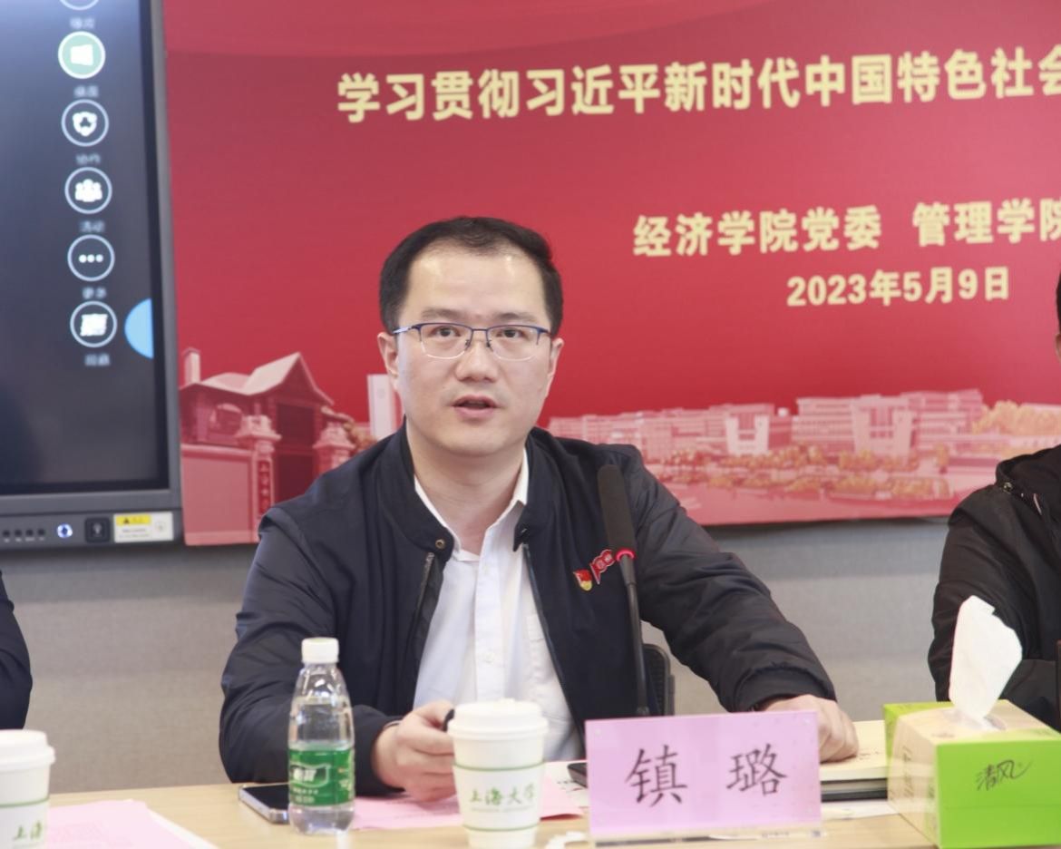 会议伊始,根据主题教育精神坚持读原著学原文悟原理。经济学院党委书记孟添围绕习近平总书记在《求是》杂志发表的重要文章“不断做强做优做大我国数字经济”进行领学,结合党的二十大报告的内容,他从高度重视与发展态势、意义研判以及面向未来如何做强做优大三个方面,重点论述了如何不断做强做优做大我国数字经济。随后,经济学院与管理学院党委代表分别介绍学院学科发展与规划。管理学院党委副书记、院长镇璐以《制度激励,守正创新——上大管理学科发展与规划》为题对学科发展现状进行回顾,提出了未来发展规划和实施路线。经济学院战略管理委员会主任殷凤围绕《应用经济学学科建的总结和思考》进行汇报。