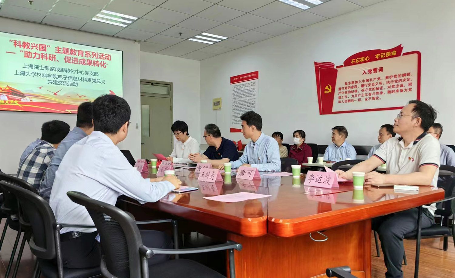 中国工程院院士专家成果展示与转化中心党支部书记汪航与支部党员分别介绍了上海工程院院士专家成果展示与转化中心的成立和发展情况,以及该中心的基本职能和服务对象,高校教师在做技术成果转化过程中的注意事项,以及如何提高对接和成果转化的成功比例等。随后,电子信息材料系党总支书记黄健介绍了材料学院及电子信息材料系的基本概况及科研情况。接着,双方就加强协同,推动科研成果转化等进行了深入交流。最后,在电子信息材料系党总支副书记谢建军的带领下,双方共同参观了电子信息材料系实验室和团队老师的研究成果。