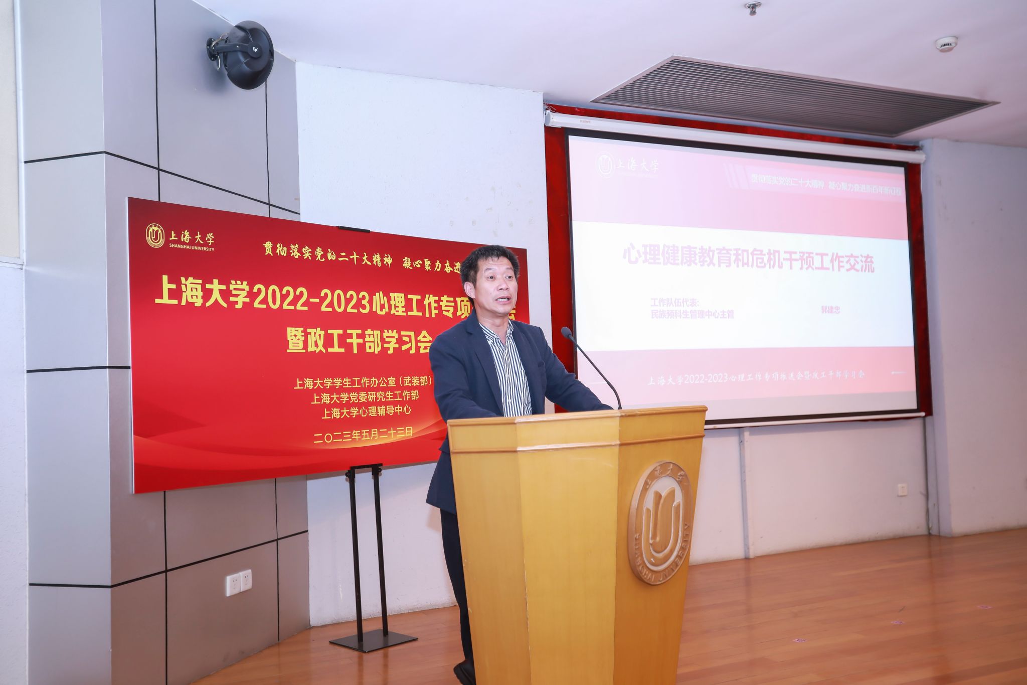 保卫处处长沈龙骥分享了校园安全与心理健康之间的关系,对于学工系统在学生危机干预工作上所起的重要作用给予充分肯定。