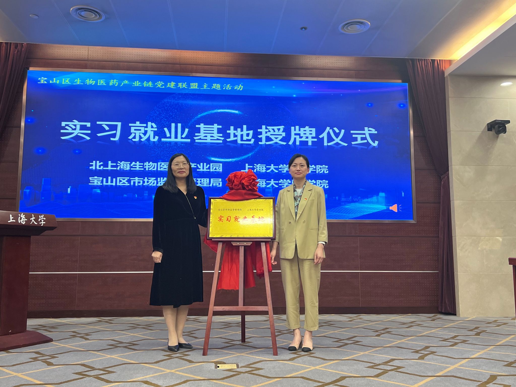在党建联盟成员的共同见证下,beat365手机官方网站医学院党委副书记、副院长盛晓娜与北上海生物医药产业园党支部书记朱东波;beat365手机官方网站医学院副院长姚萱与宝山区市场监督管理局仇丽慧副局长共同为“实习就业基地”揭牌。