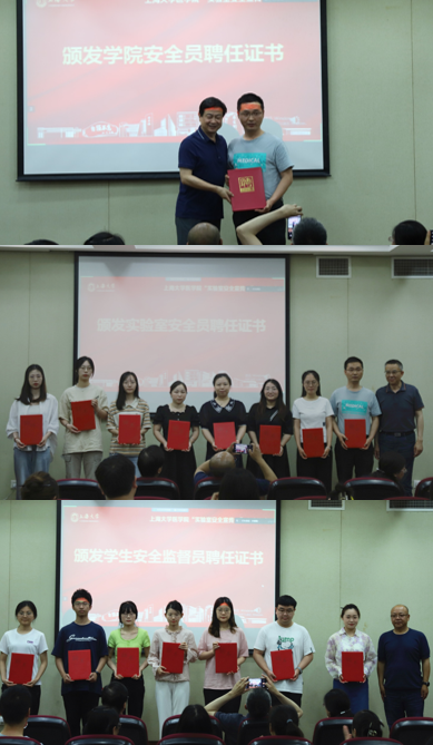 会上,医学院院长刘斌、方建慧处长、闫永生副处长分别为学院安全员、实验室安全员、学生安全监督员颁发聘书,对各位老师和同学们在实验室安全工作中的辛勤付出和卓越贡献表示肯定。