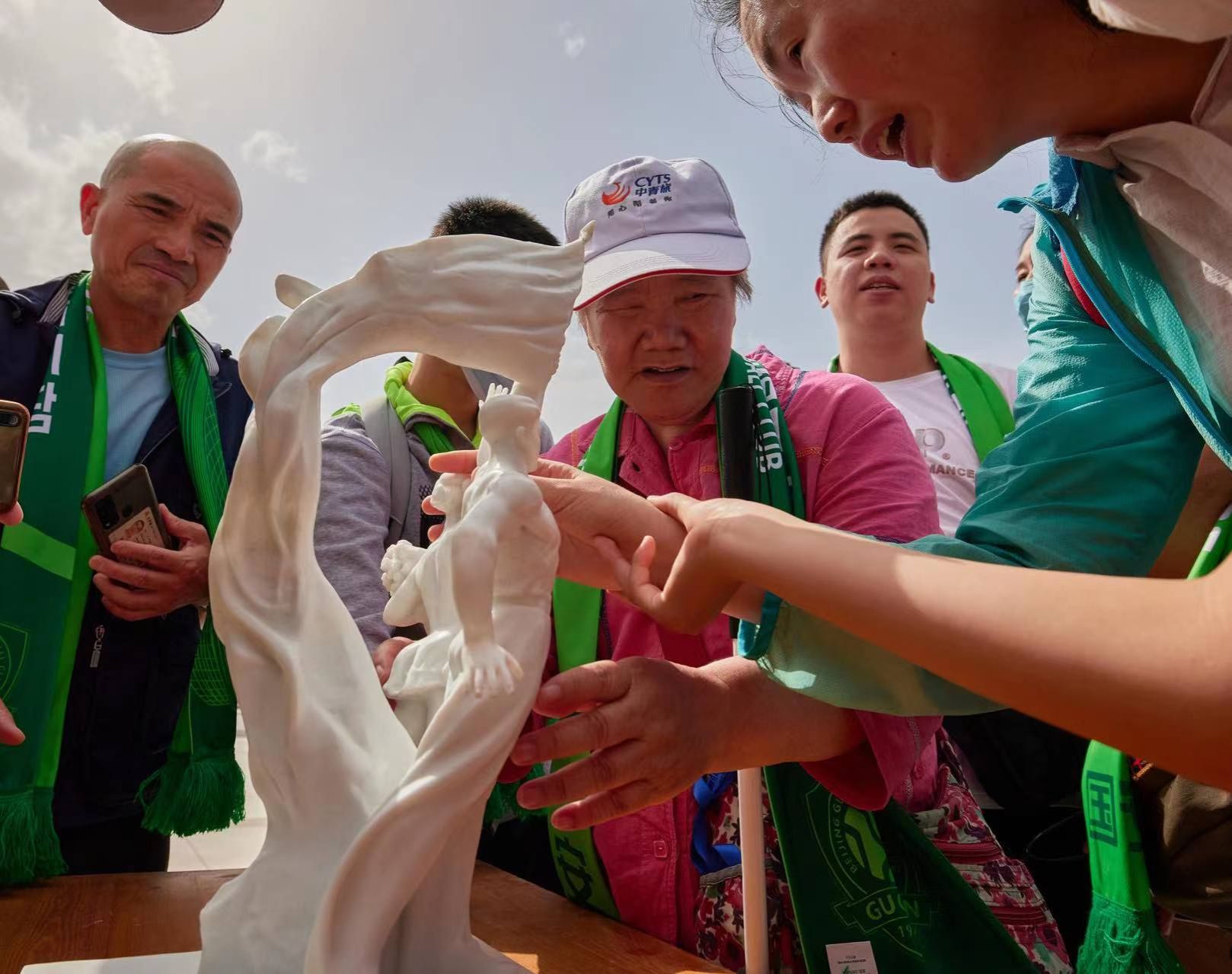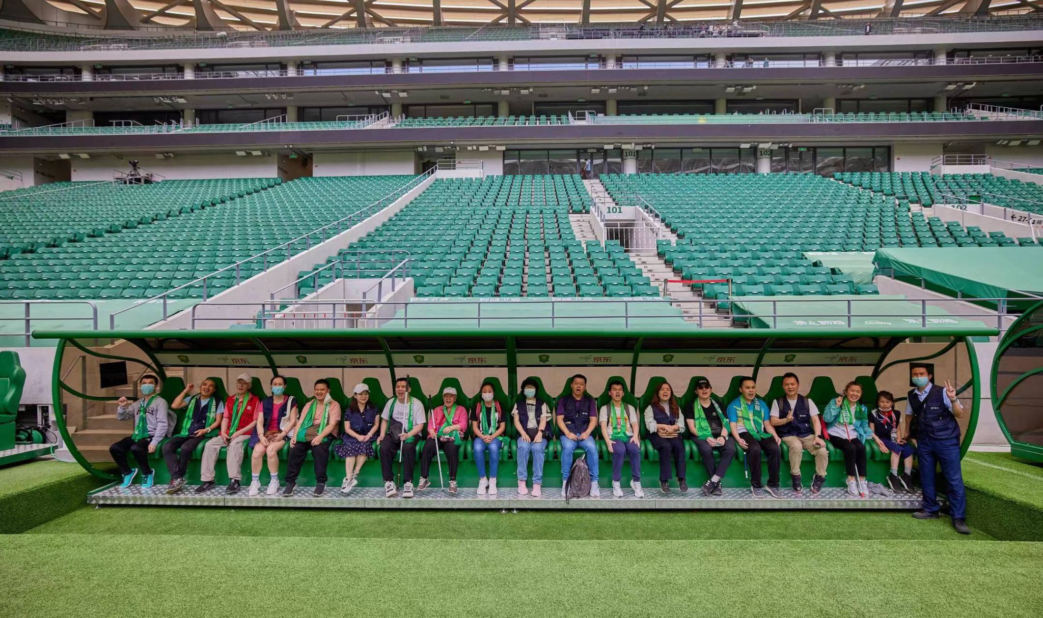 在多部门的协调组织下,视障球迷不但触碰到了“新工体”清水混凝土工艺的精湛、专业足球场音响效果的震撼以及国际级足球场草皮的质感,甚至还难得地坐到了场边的球员替补席,体验职业球员的感受。组织方还准备了等比例缩小的工体北门标志性雕塑模型,帮助视障球迷用双手感知新工体“传统外观、现代场馆”的别样设计理念。