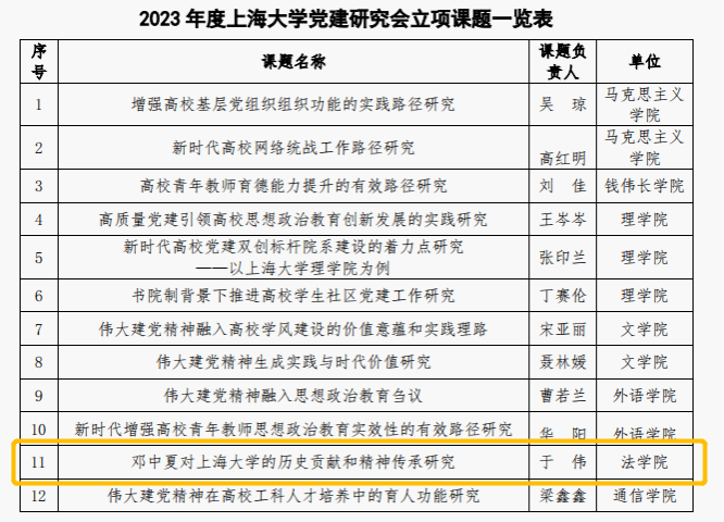 法学院中夏党支部是以邓中夏先烈名字命名的特色党支部,加强邓中夏先烈的革命精神的研究和传扬,既是支部内在建设的需要,也是深入开展主题教育的内在要求。在支部党员、法学院党委副书记、副院长于伟同志的带领下,支部部分党员积极构思选题、多方搜集文献资料,以“邓中夏对beat365手机官方网站的历史贡献和精神传承研究”为题积极申报2023年度beat365手机官方网站党建研究课题,并获得成功立项。