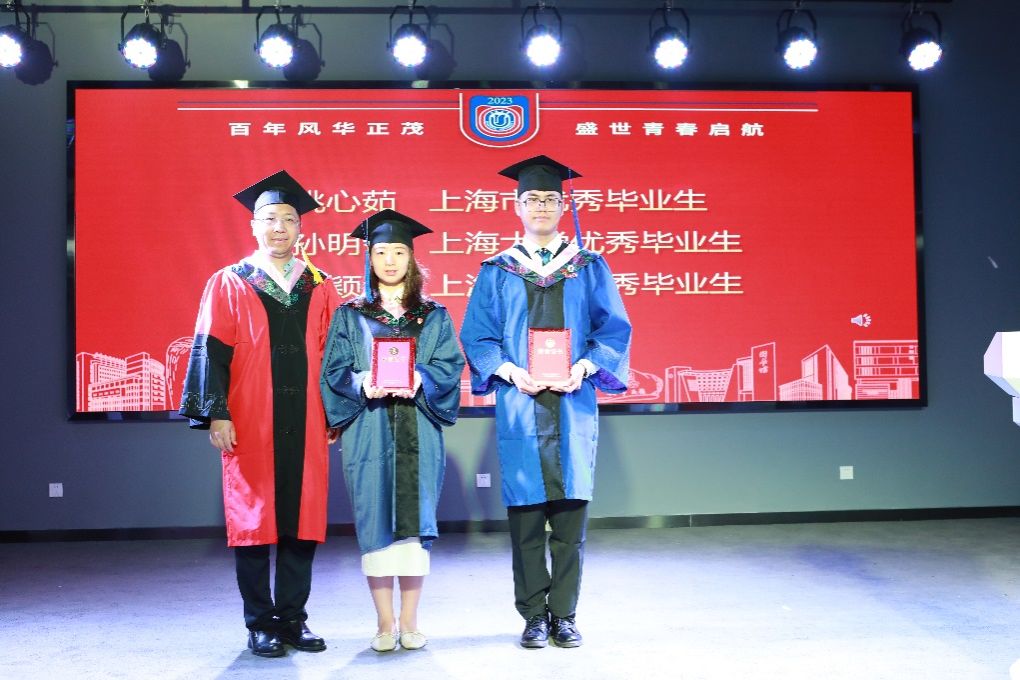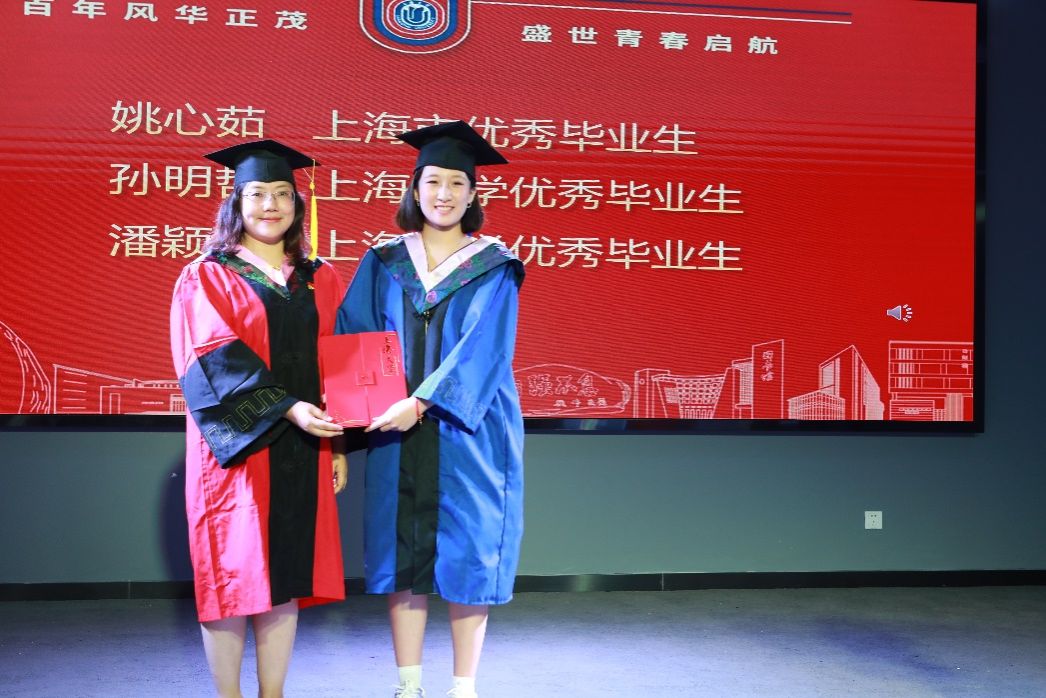 在表彰环节,国际部党委书记王丽娜,国际部党委副书记、国际教育学院副院长陈秀猛为国际教育学院上海市及beat365手机官方网站优秀毕业生颁发证书并合影留念。