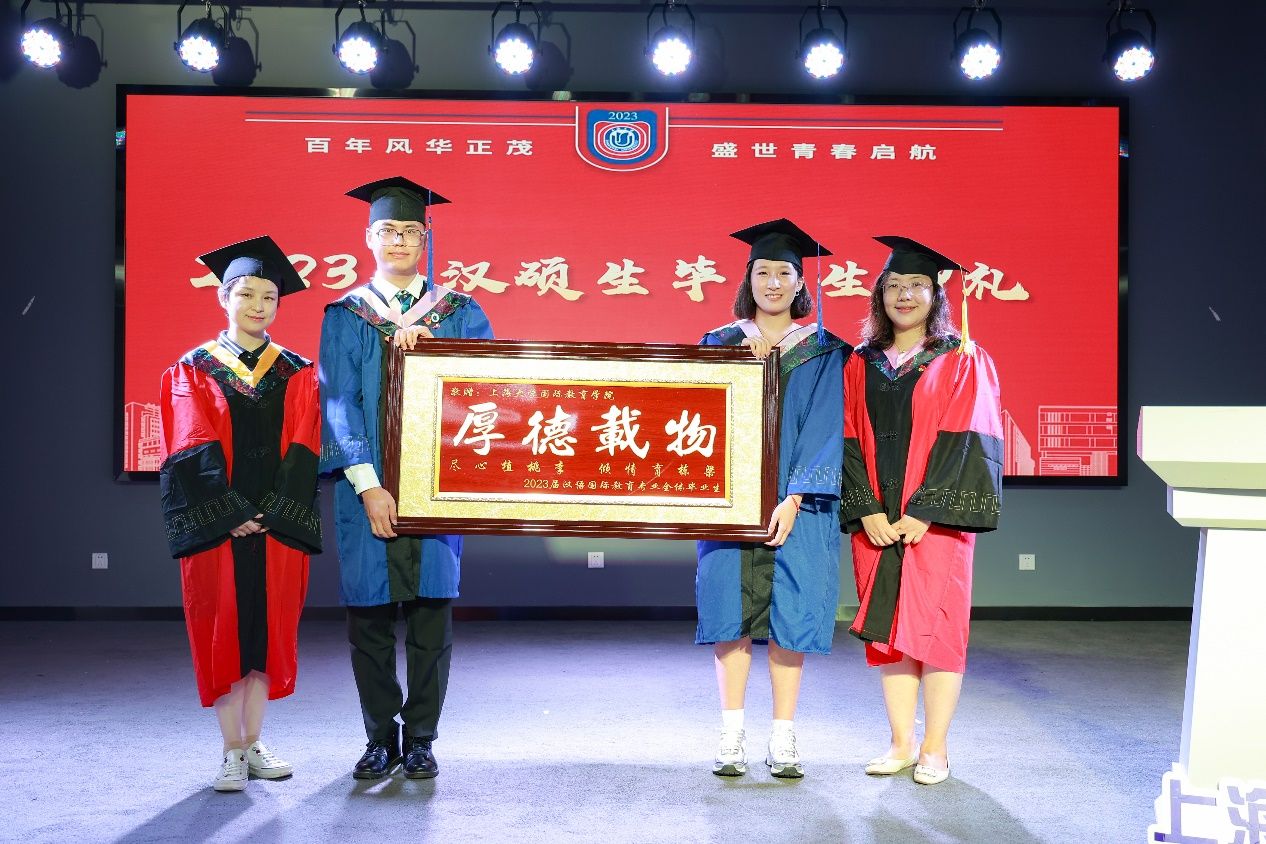 汉硕研究生代表向学院赠送毕业礼物——红豆杉木雕牌匾《厚德载物》,祝学院厚德载物,更续辉煌誉五洲!王丽娜书记与李颖洁院长上台接受毕业生赠礼。