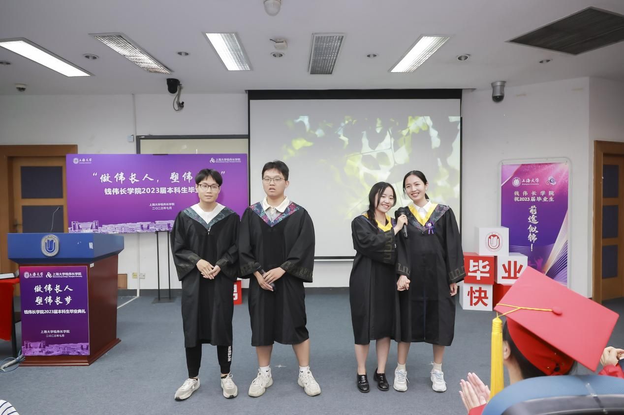 相逢是首歌,毕业生代表张伟杰、王烨、王华宇、杨万军等13位同学带来了《毕业歌曲串烧》,祝愿青春不散场,今后常相聚。为表达对学院培养的感激之情,2023届全体毕业生为学院赠送了将钱伟长老校长的话制作成的字匾:“不要相信天才论,关键在于刻苦和努力”。以钱伟长老校长的殷殷嘱托提醒伟长学子铭记校训精神。