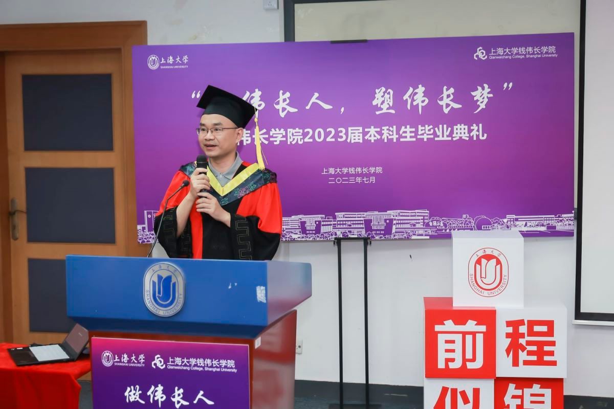 7月2日上午9:00,“做伟长人,塑伟长梦”钱伟长学院2023届本科生毕业典礼于宝山校区J102隆重举行。beat365手机官方网站党委常委、副校长聂清,钱伟长学院导师、校研究生院招生办公室主任陈沁,钱伟长学院导师、理学院党委副书记、纪委书记刘见礼,钱伟长学院导师、应用物理学方向项目主任杨国宏,钱伟长学院导师、力学与工程科学学院力学系主任宋亦诚,钱伟长学院导师、材料基因组工程研究院副院长杨炯,2020届钱伟长学院校友、中国科学院大学2023届毕业生史雨晨,钱伟长学院党委书记、校团委书记冯凌燕,钱伟长学院党委副书记、院长周全,钱伟长学院党委副书记、副院长沈青松,钱伟长学院副院长许新建,钱伟长学院副院长任伟,学院辅导员阮杜娟、魏仲奇、周玫,学院刘佳等教职工、任课教师、家长代表、校友代表、低年级本科生代表以及全体2023届本科毕业生参加本次毕业典礼。典礼由钱伟长学院2023届毕业生杨梦宇和任雨泽主持。