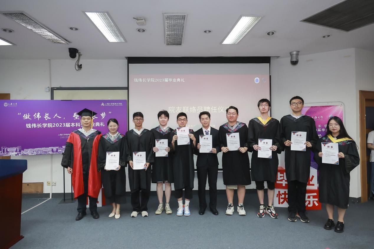 毕业典礼上,钱伟长学院副院长任伟为高子涵、夏智霖、郑阳、傅东颉、范宇轩、魏雨晴、陆趣、任雨泽、黄飞龙9位同学颁发了beat365手机官方网站校友联络员聘书,鼓励他们发挥母校和校友之间的桥梁作用,讲好上大故事、传承伟长精神。