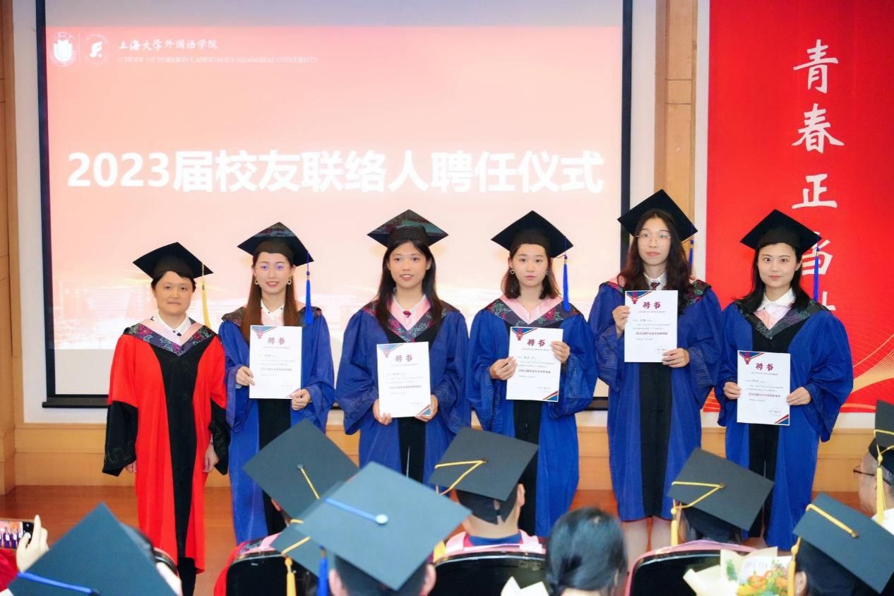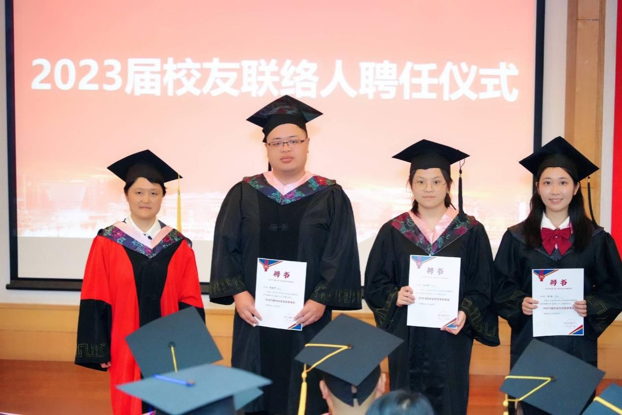 为了在毕业后更好地联络校友们,本次仪式上外国语学院聘任了9位2023届校友联络人。外国语学院校友分会会长、学院党委书记吴蔚为9位毕业生颁发校友联络人聘书,欢迎大家常回母校看看。