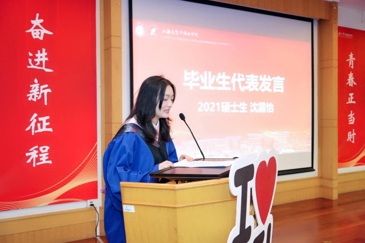 沈露怡同学通过讲述对母校的美好记忆感谢了母校的培养、师长的教诲,强调了上大的精神品质;她将奋斗二字与大家共勉,祝愿在座各位同学前途光明、前程似锦。