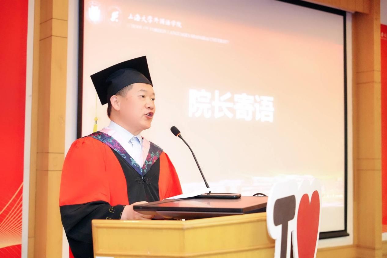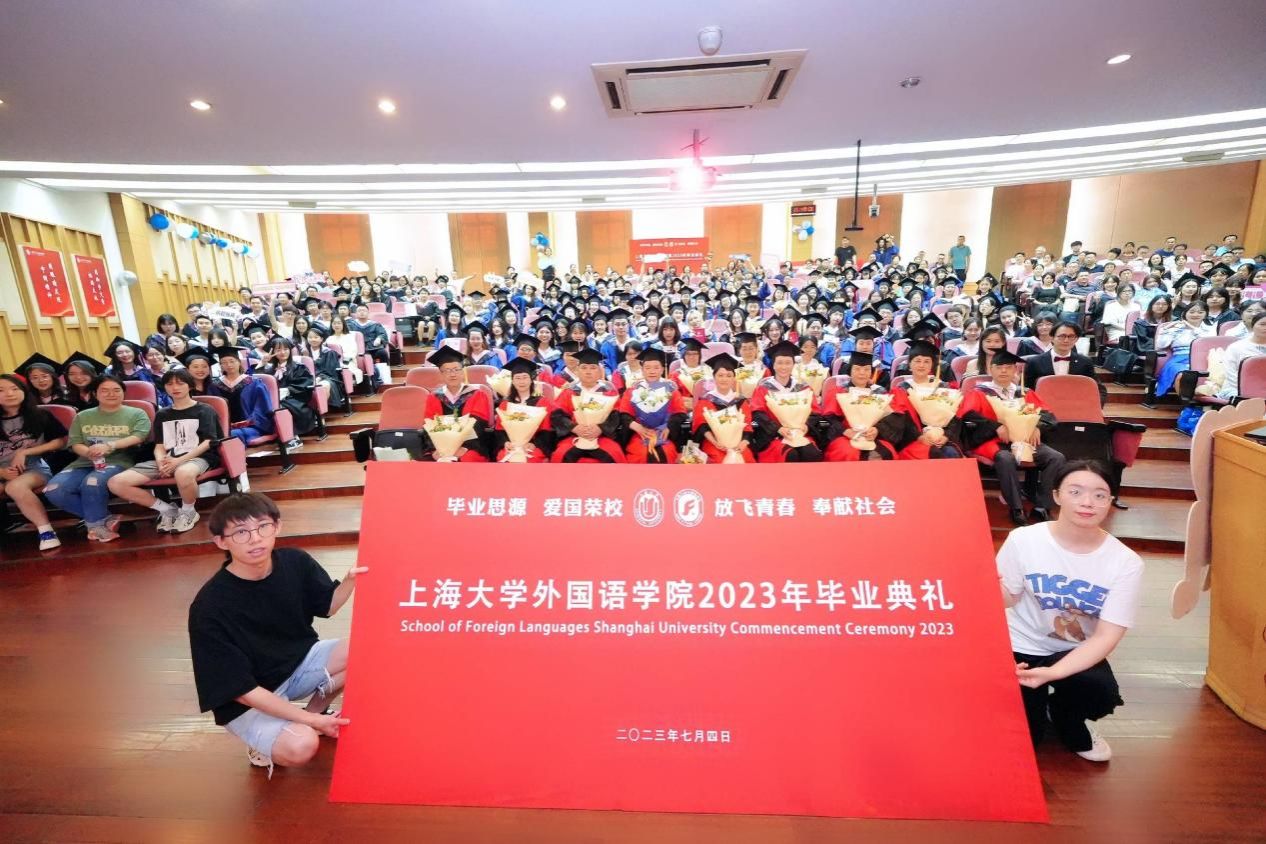 时光流转,凤凰花开,让我们将对外国语学院的记忆留在这个盛夏,带着心中的爱与感激,迎接未来的机遇和挑战,只争朝夕,不负韶华,扬帆起航,将青春华章书写在祖国大地上。今日你以上大为荣,明日上大以你为荣,外国语学院祝全体毕业生毕业快乐、前程似锦!