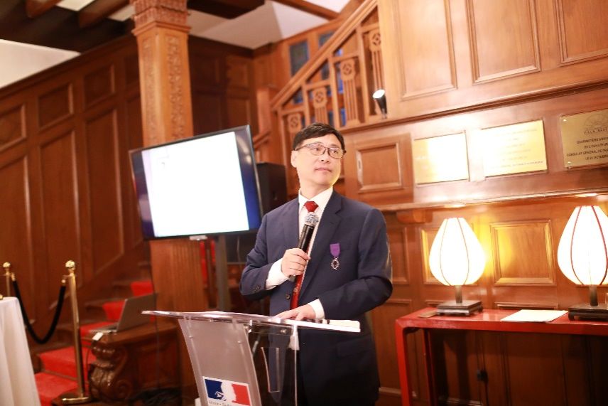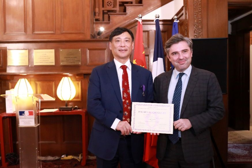 7月5日,beat365手机官方网站中欧工程技术学院执行院长刘宛予教授在法国驻上海总领事官邸巴塞别墅举行的盛大仪式上,获颁法兰西学术棕榈骑士勋章,以表彰他在教育领域的卓越成就和对中法交流合作做出的杰出贡献。