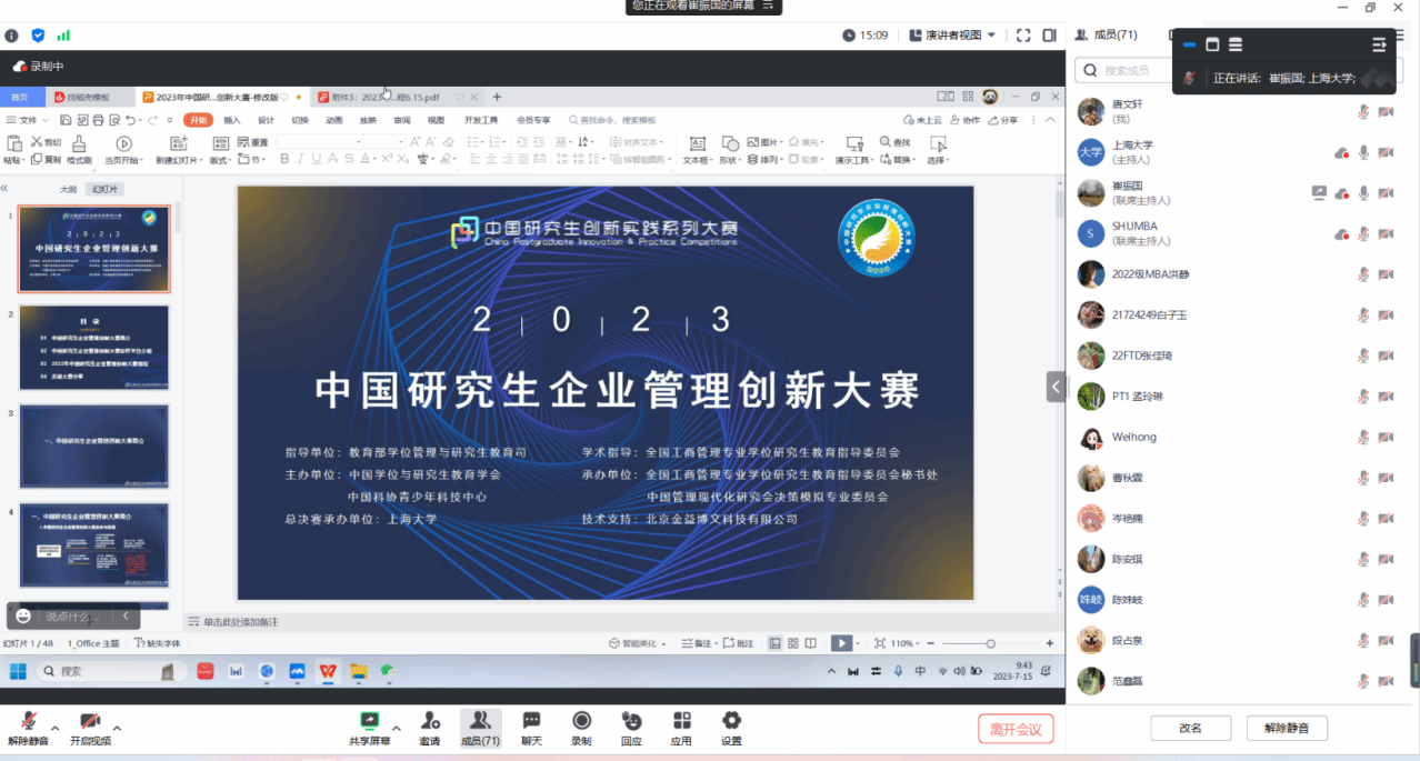 7月15日上午,beat365手机官方网站研究生企业管理创新大赛校内选拔赛宣讲培训会在线上顺利召开,beat365手机官方网站党委研究生工作部部长魏宏,管理学院党委副书记、副院长马亮,经济学院党委副书记、副院长冯玉鑫,全国企创大赛组委会工作组朱斌丹、崔振国、李金雨以及经济学院、MBA中心、管理学院、悉尼工商学院、法学院等学院的辅导员老师、参赛同学们共同参加本次宣讲培训会。