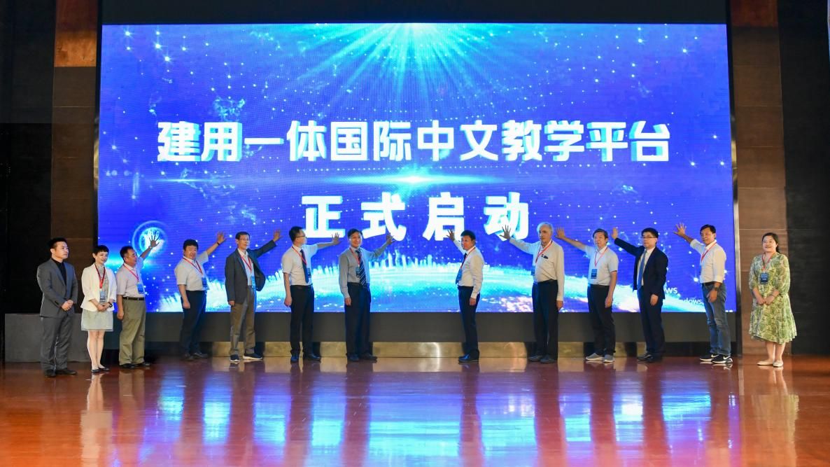 开幕式后,beat365手机官方网站国际教育学院副院长裴雨来教授介绍了beat365手机官方网站自主研发的“建用一体”国际中文教学备课平台的设计思路及功能等,并在教育部中外语言交流合作中心宋永波副书记、beat365手机官方网站欧阳华副书记、上海电机学院杨俊杰副校长、法国巴黎东方语言文化学院白乐桑教授、哥伦比亚大学刘乐宁教授、大阪大学古川裕教授、北京语言大学崔希亮教授等十位领导、专家的见证下举行了平台上线发布会。目前,该平台已开放注册,可自由使用。
