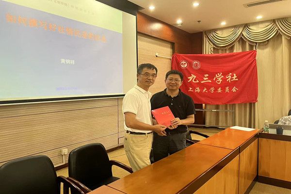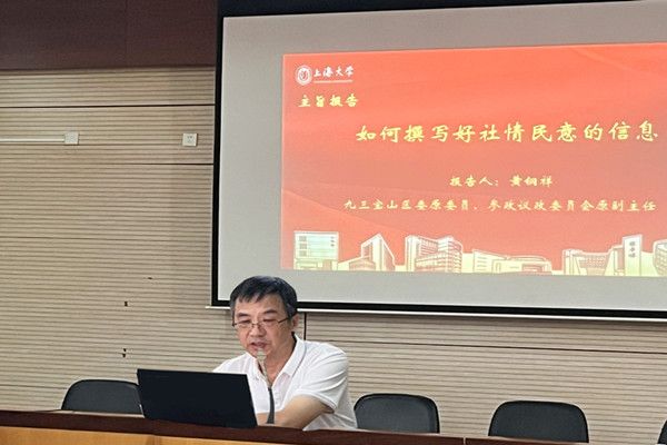随后举行九三上大第14期暑期信息工作研讨会。会议特邀了共建单位社员——九三学社宝山区委的黄钢祥做《如何撰写好社情民意的信息》主旨报告。黄钢祥结合自己多年提案和社情民意的撰写经历,向与会者分享了自己捕捉社情民意、筛选提炼成信息稿的体会和经验。他认为,信息稿要从个人视角上升到社会视角,寻找社会治理的痛点,正视政府管理的难点,更要从管理视角提出契合现实的、具可行性和操作性、符合政府管理要求的建议对策。他还从为青年社员修改信息稿的经历,分享了写好社情民意的方法和体会,让在座的青年社员受益良多。