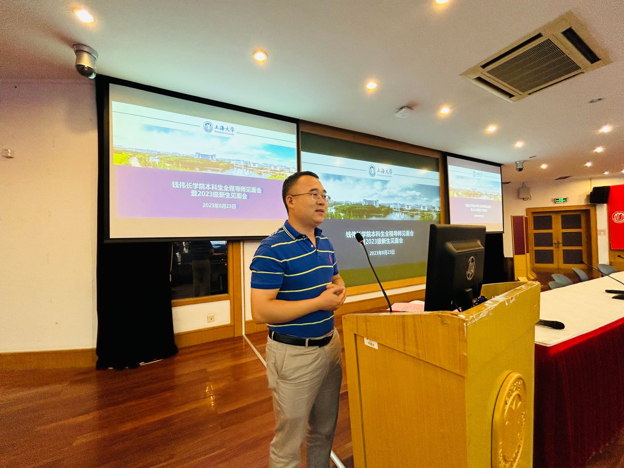 活动伊始,沈青松老师介绍了出席见面会的各位嘉宾、老师,沈老师详细介绍了钱伟长学院本科生全程导师制的工作情况。学院从大一开始按照1:5的比例为学生们配备全程导师,使导师们全程参与学生的指导培养,帮助学生确立目标,解答学生们在学习、生活中的困惑。紧接着,姚锋平老师作为钱伟长学院全程导师代表给同学们提出建议,姚老师首先欢迎2023级新生加入钱伟长学院,并提出伟长学子必须牢记使命,以更高标准要求自己。之后, 姚老师以2019级钱伟长学院毕业生数据为例,勉励同学们好好学习,告诫同学们要合理安排时间,找准定位,做好规划,尽快实现从高中生角色向大学角色的转变。之后,邢菲菲老师、赵发友老师分别从化学、数学专业学习的角度向新生们提出了建议,并表达了欢迎与祝福。