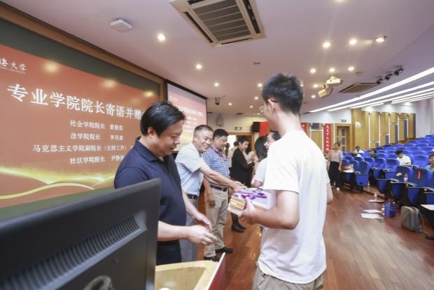 社会学院院长黄晓春、法学院院长李凤章、马克思主义学院副院长(主持工作)叶海涛、社区学院院长尹静波为新生代表赠书并寄语新生。叶海涛副院长(主持工作)寄语新生,哲学是所有学科之母,马克思主义哲学是看家本领,希望同学们学习哲学知识,并与其他学科融汇贯通。李凤章院长指出,希望同学们通过研读经典系统学习法学知识,锤炼法治思维。尹静波院长认为每个同学都是一个小宇宙,希望同学们通过自己努力激发潜能,创造美好未来。黄晓春院长指出,社会学让每个人把自己日常生活中普遍的事务与宏大的社会结构和历史建立链接,希望同学们通过经典阅读发现社会之美。四位新生代表上台并接受赠书。