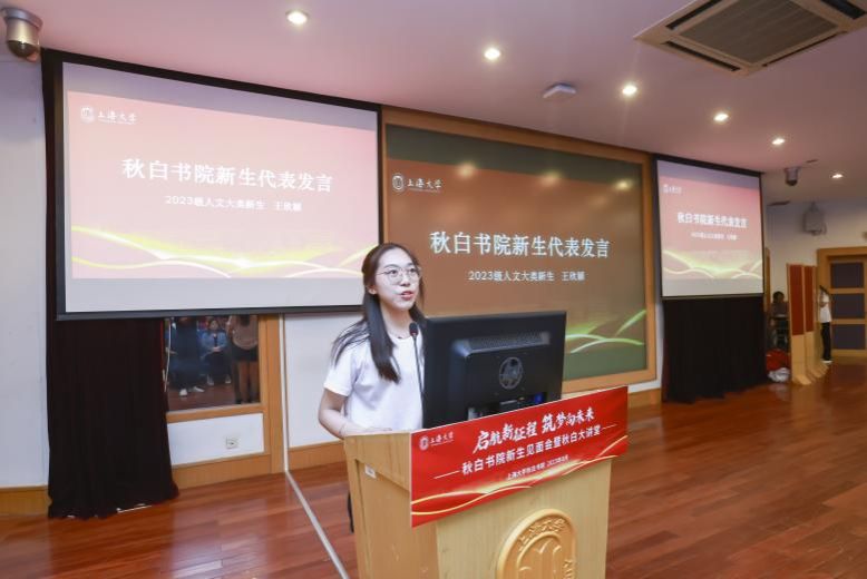 2023级人文大类新生王欣颖作为新生代表发言。秋白书院拥有丰富的师资力量和跨学科资源,也为学生提供了创新发展的平台。作为新生,应时刻保持一颗不断进取之心,不断突破自己的局限,在书院平台中实现德智体美劳全面发展,将所学落到实处,用行动架起现实与理想之间的桥梁。
