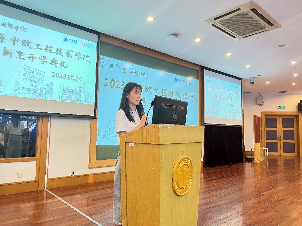 随后,由2022级导生代表王蕴琪同学发表了激情洋溢的发言。王蕴琪同学首先深情回顾了自己的大一生活,将我们带入她成长的轨迹。她以“别样人生,源起中欧”为主题,引领我们进入中欧工程技术学院这个独特的大家庭。她认为中欧的怀抱中,新生们将迎来全新的可能性,不断追求卓越,超越自我。紧接着,王蕴琪同学分享了自己大一阶段的感悟。她真挚地诉说着中欧这个精彩的舞台,鼓励新生们在这里培养独立品格,锤炼自律素质,涵养勇往直前的勇气。她的发言如一束明灯,为新生即将开始的大学旅程上指引着前进的方向,照亮着前行的道路。在她的话语中,蕴含着对未来的期许与信心,激励着新生们在这片知识的海洋中追求卓越,书写属于自己的精彩人生。