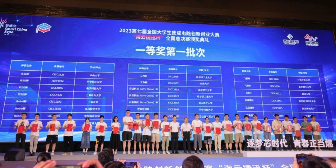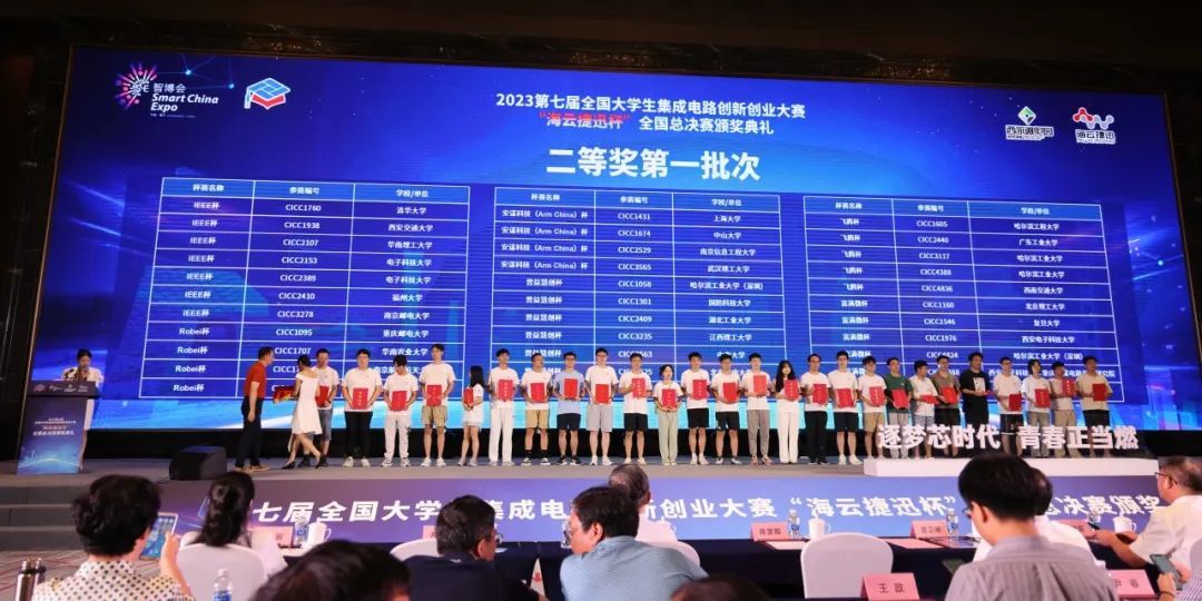 2023年8月22日上午,第七届全国大学生集成电路创新创业大赛“海云捷迅杯”全国总决赛颁奖典礼在重庆举行。工业和信息化部电子信息司集成电路处关子霄、工业和信息化部人才交流中心副主任曾卫明、重庆市经济和信息化委员会二级巡视员代修超、重庆西永微电子产业园区开发有限公司副总经理陈昱阳、重庆科技学院副校长刘德绍、重庆市科学技术局成果转化与创新创业处四级调研员王蔡君、重庆海云捷迅科技有限公司总经理张征宇等领导出席活动。此外,大赛杯赛企业领导、高校参赛师生代表以及行业各界人士汇聚一堂,共同参加了这场颁奖典礼。
