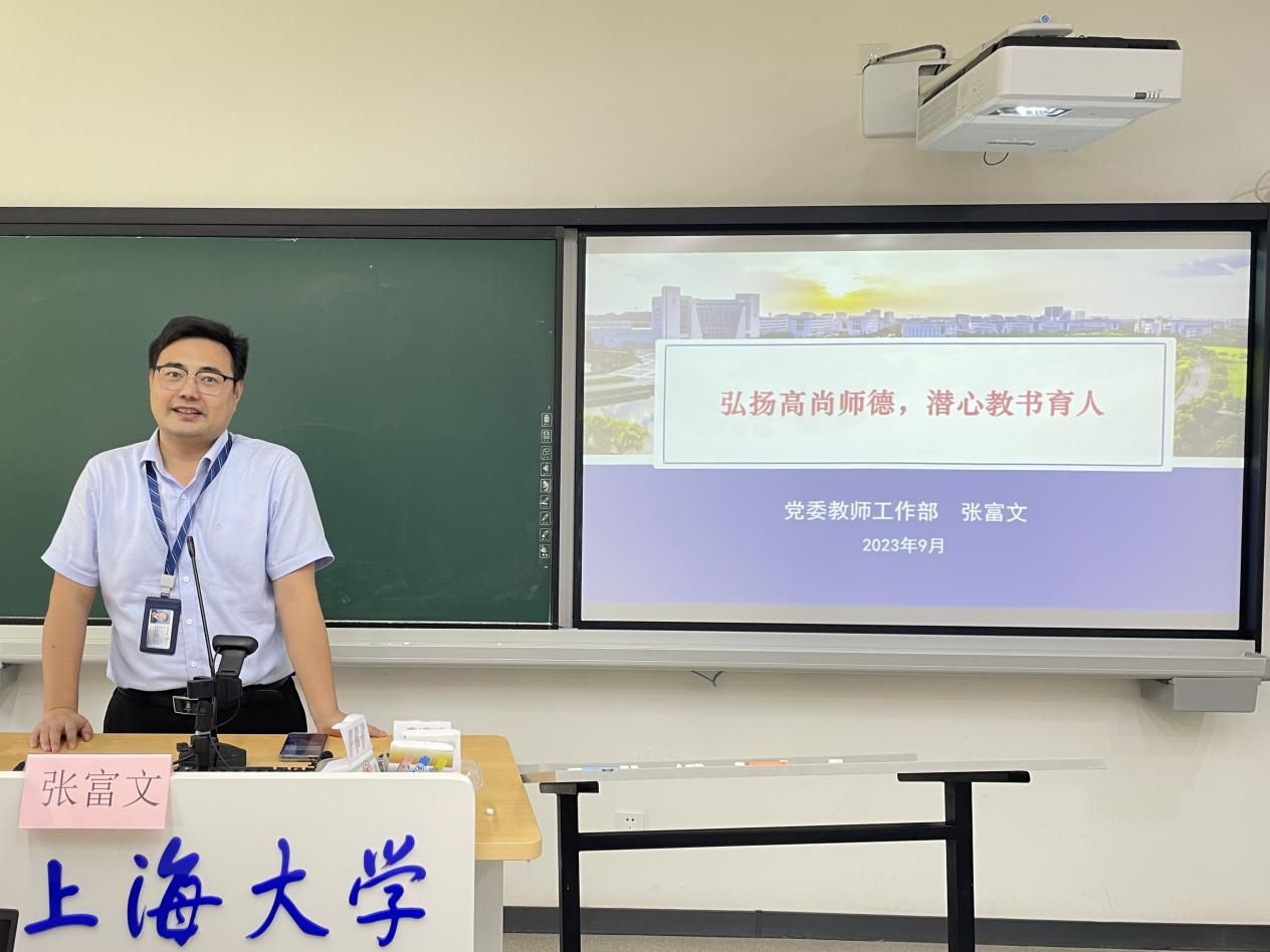 为主动迎接beat365手机官方网站“师德师风建设月”,全力做好师德师风和教师思政工作,9月8日,beat365手机官方网站国际教育学院在宝山校区D115举行新学期“师德师风月”系列活动。上大教工部副部长张富文,国际部党委书记王丽娜,国际部副部长、国际教育学院院长李颖洁,国际部党委副书记、国际教育学院副院长陈秀猛,国际教育学院副院长裴雨来,国际教育学院副院长张新玲,以及学院教研中心全体教师出席此次活动。活动共包括讲座、师德师风承诺书签约仪式、优秀本科全程导师代表分享暨全体导师交流三个环节。