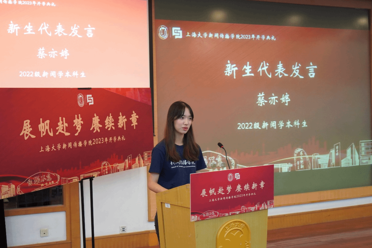 典礼上,新生代表们也与大家分享了他们进入新闻传播学院学习的喜悦与期许。2022级新闻学专业的本科新生代表蔡亦婷表示,当前新闻传播学子面临着一定的挑战,但新传学子仍要保持坚定的信念,保持对专业的热爱,打好专业基础,提升专业实力。